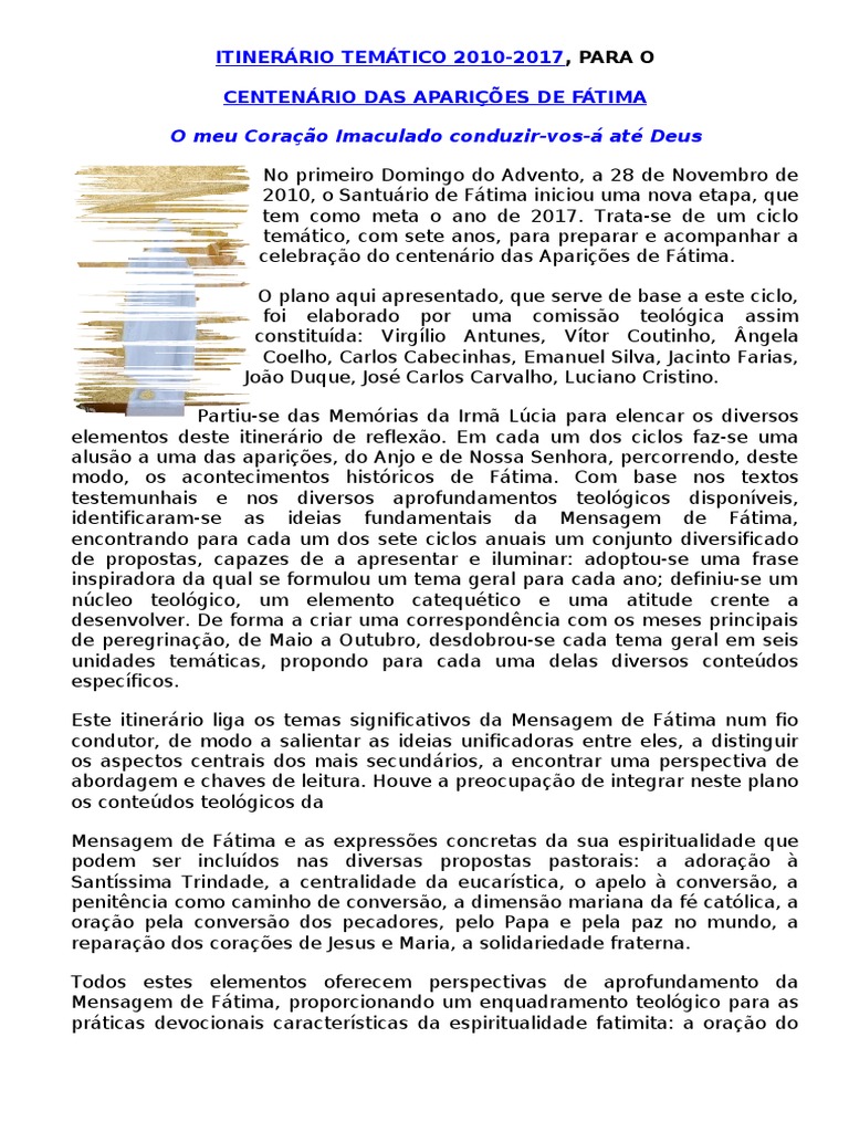 do Advento, a 28 de Novembro de 2010, o Santurio de Ftima iniciou uma nova etapa, que tem como meta o ano de 2017. Trata-se de um ciclo temtico, com sete anos, para preparar e acompanhar a celebrao do centenrio das Aparies de Ftima. O plano aqui apresentado, que serve de base a este ciclo, foi elaborado por uma comisso teolgica assim constituda: Virglio Antunes, Vtor Coutinho, ngela Coelho, Carlos Cabecinhas, Emanuel Silva, Jacinto Farias, Joo Duque, Jos Carlos Carvalho, Luciano Cristino. Partiu-se das Memrias da Irm Lcia para elencar os diversos elementos deste itinerrio de reflexo. Em cada um dos ciclos faz-se uma aluso a uma das aparies, do Anjo e de Nossa Senhora, percorrendo, deste modo, os acontecimentos histricos de Ftima. Com base nos textos testemunhais e nos diversos aprofundamentos teolgicos disponveis, identificaram-se as ideias fundamentais da Mensagem de Ftima, encontrando para cada um dos sete ciclos anuais um conjunto diversificado de propostas, capazes de a apresentar e iluminar: adoptou-se uma frase inspiradora da qual se formulou um tema geral para cada ano; definiu-se um ncleo teolgico, um elemento catequtico e uma atitude crente a desenvolver. De forma a criar uma correspondncia com os meses principais de peregrinao, de Maio a Outubro, desdobrou-se cada tema geral em seis unidades temticas, propondo para cada uma delas diversos contedos especficos. Este itinerrio liga os temas significativos da Mensagem de Ftima num fio condutor, de modo a salientar as ideias unificadoras entre eles, a distinguir os aspectos centrais dos mais secundrios, a encontrar uma perspectiva de abordagem e chaves de leitura. Houve a preocupao de integrar neste plano os contedos teolgicos da Mensagem de Ftima e as expresses concretas da sua espiritualidade que podem ser includos nas diversas propostas pastorais: a adorao Santssima Trindade, a centralidade da eucarstica, o apelo converso, a penitncia como caminho de converso, a dimenso mariana da f catlica, a orao pela converso dos pecadores, pelo Papa e pela paz no mundo, a reparao dos coraes de Jesus e Maria, a solidariedade fraterna. Todos estes elementos oferecem perspectivas de aprofundamento da Mensagem de Ftima, proporcionando um enquadramento teolgico para as prticas devocionais caractersticas da espiritualidade fatimita: a orao do