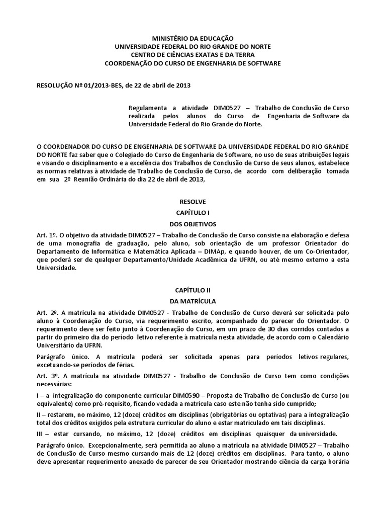 RESOLUO N 01/2013-BES, de 22 de abril de 2013 Regulamenta a atividade DIM0527 Trabalho de Concluso de Curso realizada pelos alunos do Curso de Engenharia de Software da Universidade Federal do Rio Grande do Norte. O COORDENADOR DO CURSO DE ENGENHARIA DE SOFTWARE DA UNIVERSIDADE FEDERAL DO RIO GRANDE DO NORTE faz saber que o Colegiado do Curso de Engenharia de Software, no uso de suas atribuies legais e visando o disciplinamento e a excelncia dos Trabalhos de Concluso de Curso de seus alunos, estabelece as normas relativas atividade de Trabalho de Concluso de Curso, de acordo com deliberao tomada em sua 2 Reunio Ordinria do dia 22 de abril de 2013, RESOLVE CAPTULO I DOS OBJETIVOS Art. 1. O objetivo da atividade DIM0527 Trabalho de Concluso de Curso consiste na elaborao e defesa de uma monografia de graduao, pelo aluno, sob orientao de um professor Orientador do Departamento de Informtica e Matemtica Aplicada DIMAp, e quando houver, de um Co-Orientador, que poder ser de qualquer Departamento/Unidade Acadmica da UFRN, ou at mesmo externo a esta Universidade. CAPTULO II DA MATRCULA Art. 2. A matrcula na atividade DIM0527 - Trabalho de Concluso de Curso dever ser solicitada pelo aluno Coordenao do Curso, via requerimento escrito, acompanhado do parecer do Orientador. O requerimento deve ser feito junto Coordenao do Curso, em um prazo de 30 dias corridos contados a partir do primeiro dia do perodo letivo referente matrcula nesta atividade, de acordo com o Calendrio Universitrio da UFRN. Pargrafo nico. A matrcula poder ser solicitada apenas para perodos letivos regulares, excetuando-se perodos de frias. Art. 3. A matrcula na atividade DIM0527 - Trabalho de Concluso de Curso tem como condies necessrias: I a integralizao do componente curricular DIM0590 Proposta de Trabalho de Concluso de Curso (ou equivalente) como pr-requisito, ficando vedada a matrcula caso este no tenha sido cumprido; II restarem, no mximo, 12 (doze) crditos em disciplinas (obrigatrias ou optativas) para a integralizao total dos crditos exigidos pela estrutura curricular do aluno e estar matriculado em tais disciplinas. III estar cursando, no mximo, 12 (doze) crditos em disciplinas quaisquer da universidade. Pargrafo nico. Excepcionalmente, ser permitida ao aluno a matrcula na atividade DIM0527 Trabalho de Concluso de Curso mesmo cursando mais de 12 (doze) crditos em disciplinas. Para tanto, o aluno deve apresentar requerimento anexado de parecer de seu Orientador mostrando cincia da carga horria