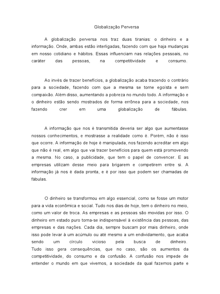 Ao inv$s de trazer benef%cios, a globalização acaba trazendo o contr!rio para a sociedade, fazendo com que a mesma se torne ego%sta e sem compai&ão. Al$m disso, aumentando a pobreza no mundo todo. A informação e o dinheiro estão sendo mostrados de forma err'nea para a sociedade, nos fazendo crer em uma globalização de f!bulas.