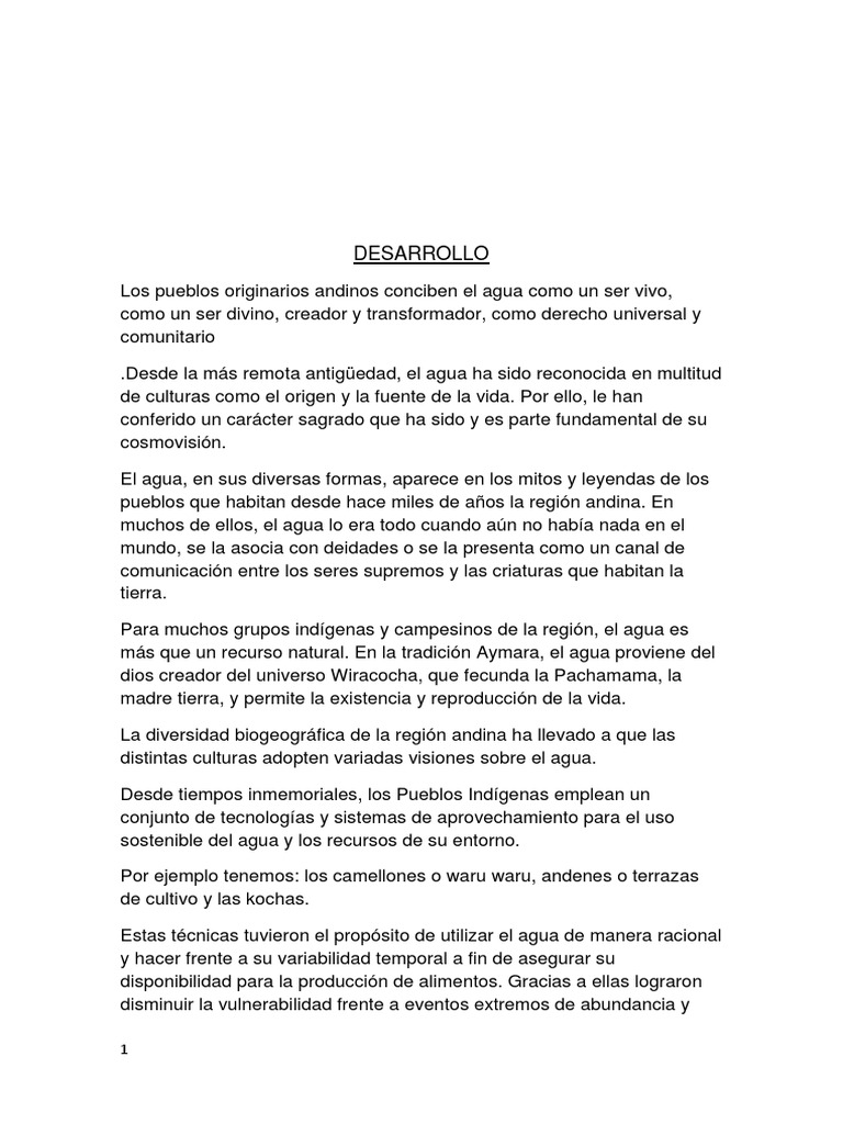 Los pueblos originarios andinos conciben el agua como un ser vivo, como un ser divino, creador y transformador, como derecho universal y comunitario .Desde la más remota antigüedad, el agua ha sido reconocida en multitud de culturas como el origen y la fuente de la vida. Por ello, le han conferido un carácter sagrado que ha sido y es parte fundamental de su cosmovisión. El agua, en sus diversas formas, aparece en los mitos y leyendas de los pueblos que habitan desde hace miles de años la región andina. En muchos de ellos, el agua lo era todo cuando aún no había nada en el mundo, se la asocia con deidades o se la presenta como un canal de comunicación entre los seres supremos y las criaturas que habitan la tierra. Para muchos grupos indígenas y campesinos de la región, el agua es más que un recurso natural. En la tradición Aymara, el agua proviene del dios creador del universo Wiracocha, que fecunda la Pachamama, la madre tierra, y permite la existencia y reproducción de la vida. La diversidad biogeográfica de la región andina ha llevado a que las distintas culturas adopten variadas visiones sobre el agua. Desde tiempos inmemoriales, los Pueblos Indígenas emplean un conjunto de tecnologías y sistemas de aprovechamiento para el uso sostenible del agua y los recursos de su entorno. Por ejemplo tenemos: los camellones o waru waru, andenes o terrazas de cultivo y las kochas. Estas técnicas tuvieron el propósito de utilizar el agua de manera racional y hacer frente a su variabilidad temporal a fin de asegurar su disponibilidad para la producción de alimentos. Gracias a ellas lograron disminuir la vulnerabilidad frente a eventos extremos de abundancia y