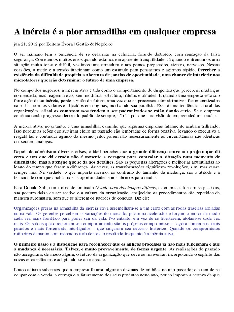 jun 21, 2012 por Editora Évora | Gestão & Negócios O ser humano tem a tendência de se desarmar na calmaria, ficando distraído, com sensação da falsa segurança. Cometemos muitos erros quando estamos em aparente tranquilidade. Já quando enfrentamos uma situação muito tensa e difícil, vestimos uma armadura e nos pomos preparados, atentos, nervosos. Nessas ocasiões, o medo e a tensão funcionam como um estímulo para pensarmos e agirmos rápido. Perceber a existência da dificuldade propicia a abertura de janelas de oportunidade, uma chance de interferir nos microfatores que irão determinar o futuro de uma empresa. No campo dos negócios, a inércia ativa é tida como o comportamento de dirigentes que percebem mudanças no mercado, mas reagem a elas, sem modificar estrutura, hábitos e atitudes. E quando uma empresa está sob forte ação dessa inércia, perde a visão do futuro, uma vez que os processos administrativos ficam enraizados na rotina, com os valores enrijecidos em dogmas, motivando sua paralisia. Essa é uma tendência natural das organizações, afinal os compromissos tendem a ser padronizados se estão dando certo . Se a empresa continua tendo progresso dentro do padrão de sempre, não há por que – na visão do empreendedor – mudar. A inércia ativa, no entanto, é uma armadilha, caminho que algumas empresas fatalmente acabam trilhando. Isso porque as ações que surtiram efeito no passado são lembradas de forma positiva, levando o executivo a resgatá-las e continuar agindo do mesmo jeito, porém não necessariamente as circunstâncias são idênticas ou, sequer, análogas. Depois de administrar diversas crises, é fácil perceber que a grande diferença entre um projeto que dá certo e um que dá errado não é somente a coragem para controlar a situação num momento de dificuldade, mas a atenção que se dá aos detalhes. São as pequenas alterações e melhorias acumuladas ao longo do tempo que fazem a diferença. Às vezes, as transformações significam revoluções, sim, mas quase sempre não. Na verdade, o que importa mesmo, ao contrário do tamanho da mudança, são a atitude e a tenacidade com que analisamos as oportunidades e nos abrimos para mudar. Para Donald Sull, numa obra denominada O lado bom dos tempos difíceis, as empresas tornam-se passivas, sua postura deixa de ser reativa e a cultura da organização, enrijecida; os procedimentos são repetidos de maneira automática, sem que se alterem os padrões de conduta. Diz ele: Organizações presas na armadilha da inércia ativa assemelham-se a um carro com as rodas traseiras atoladas numa vala. Os gerentes percebem as variações do mercado, pisam no acelerador e forçam o motor de modo cada vez mais frenético para poder sair da vala. No entanto, em vez de se libertarem, atolam-se cada vez mais. Os sulcos que direcionam seu comportamento são os próprios compromissos – agora numerosos, mais pesados e mais fortemente interligados – que calçaram seu sucesso histórico. Quando os compromissos rotineiros deparam com mercados turbulentos, o resultado frequente é a inércia ativa. O primeiro passo é a disposição para reconhecer que os antigos processos já não mais funcionam e que a mudança é necessária. Talvez, e muito provavelmente, de forma urgente. As realizações do passado não asseguram, de modo algum, o futuro da organização que deve se reinventar, incorporando o espírito das novas circunstâncias e adaptando-se ao mercado. Pouco adianta sabermos que a empresa faturou algumas dezenas de milhões no ano passado; ela tem de se ocupar com a venda, a entrega e o faturamento dos seus produtos neste ano, pouco importa a certeza de que