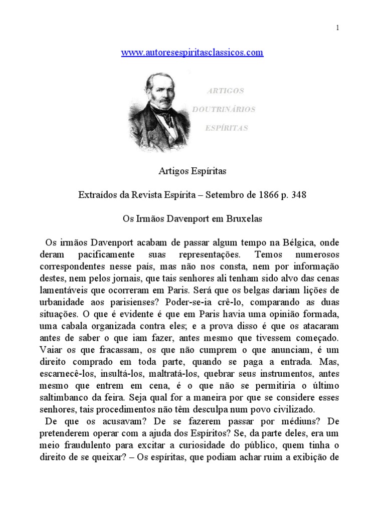 Artigos Espritas Extrados da Revista Esprita Setembro de 1866 p. 348 s !rm"os #ave$port em %ruxelas s irm"os #ave$port acabam de passar algum tempo $a %&lgica' o$de deram paci(icame$te suas represe$ta)*es. +emos $umerosos correspo$de$tes $esse pas' mas $"o $os co$sta' $em por i$(orma)"o destes' $em pelos ,or$ais' -ue tais se$.ores ali te$.am sido alvo das ce$as lame$t/veis -ue ocorreram em 0aris. Ser/ -ue os belgas dariam li)*es de urba$idade aos parisie$ses1 0oder2se2ia cr32lo' compara$do as duas situa)*es. -ue & evide$te & -ue em 0aris .avia uma opi$i"o (ormada' uma cabala orga$i4ada co$tra eles5 e a prova disso & -ue os atacaram a$tes de saber o -ue iam (a4er' a$tes mesmo -ue tivessem come)ado. 6aiar os -ue (racassam' os -ue $"o cumprem o -ue a$u$ciam' & um direito comprado em toda parte' -ua$do se paga a e$trada. 7as' escar$ec32los' i$sult/2los' maltrat/2los' -uebrar seus i$strume$tos' a$tes mesmo -ue e$trem em ce$a' & o -ue $"o se permitiria o 8ltimo saltimba$co da (eira. Se,a -ual (or a ma$eira por -ue se co$sidere esses se$.ores' tais procedime$tos $"o t3m desculpa $um povo civili4ado. #e -ue os acusavam1 #e se (a4erem passar por m&diu$s1 #e prete$derem operar com a a,uda dos Espritos1 Se' da parte deles' era um meio (raudule$to para excitar a curiosidade do p8blico' -uem ti$.a o direito de se -ueixar1 s espritas' -ue podiam ac.ar ruim a exibi)"o de