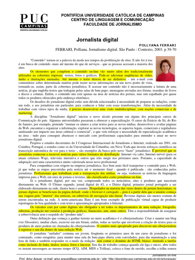 Jornalismo on-line Prof. Artur Araujo –e-mail: artur.araujo@puc-campinas.edu.br / site: http://docentes.puc-campinas.edu.br/clc/arturaraujo/ Página 1 de 11