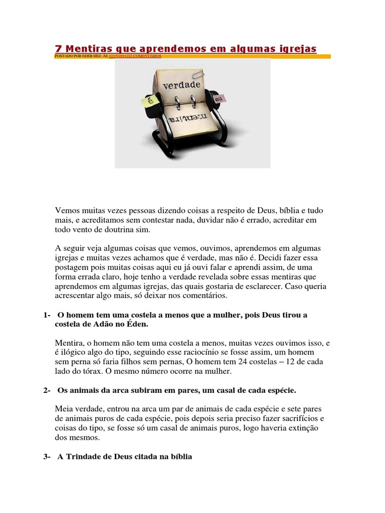 Vemos muitas vezes pessoas dizendo coisas a respeito de Deus, bblia e tudo mais, e acreditamos sem contestar nada, duvidar no errado, acreditar em todo vento de doutrina sim. A seguir veja algumas coisas que vemos, ouvimos, aprendemos em algumas igrejas e muitas vezes achamos que verdade, mas no . Decidi fazer essa postagem pois muitas coisas aqui eu j ouvi falar e aprendi assim, de uma forma errada claro, hoje tenho a verdade revelada sobre essas mentiras que aprendemos em algumas igrejas, das quais gostaria de esclarecer. Caso queria acrescentar algo mais, s deixar nos comentrios. 1- O homem tem uma costela a menos que a mulher, pois Deus tirou a costela de Ado no den. Mentira, o homem no tem uma costela a menos, muitas vezes ouvimos isso, e ilgico algo do tipo, seguindo esse raciocnio se fosse assim, um homem sem perna s faria filhos sem pernas, O homem tem 24 costelas 12 de cada lado do trax. O mesmo nmero ocorre na mulher. 2- Os animais da arca subiram em pares, um casal de cada espcie. Meia verdade, entrou na arca um par de animais de cada espcie e sete pares de animais puros de cada espcie, pois depois seria preciso fazer sacrifcios e coisas do tipo, se fosse s um casal de animais puros, logo haveria extino dos mesmos. 3- A Trindade de Deus citada na bblia