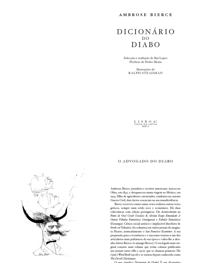 Ambrose Bierce, jornalista e escritor americano, nasceu no Ohio, em 1842, e desapareceu numa viagem ao Mxico, em 1914. Filho de agricultores carenciados, combateu na cruenta Guerra Civil, dois factos essenciais na sua mundividncia. Bierce escreveu contos umas vezes realistas outras vezes gticos, sempre num estilo seco e econmico. H duas colectneas com edio portuguesa: Um Acontecimento na Ponte de Owl Creek (Assrio & Alvim) Esopo Emendado & Outras Fbulas Fantsticas (Antgona) e Fbulas Fantsticas (Estampa). Crtico social satrico e implacvel (herdeiro de Swift ou Voltaire), foi colunista em vrios jornais do magnata Hearst, nomeadamente o San Francisco Examiner. A sua propenso para a veemncia e o sarcasmo tornou-o um dos articulistas mais polmicos da sua poca e valeu-lhe a alcunha bitter Bierce (o amargo Bierce). O seu legado mais original consiste num volume que rene colunas publicadas nos jornais entre 1881 e 1906, que se chamou primeiro The Cynics Word Book (1906) e se tornou depois conhecido como The Devils Dictionary. O que significa Dicionrio do Diabo? um dicionrio escrito do ponto de vista do Diabo? Ou do ponto de vista de um autor tido como diablico? Ou diablico o esprito que anima este Dicionrio? Todas estas leituras so possveis.