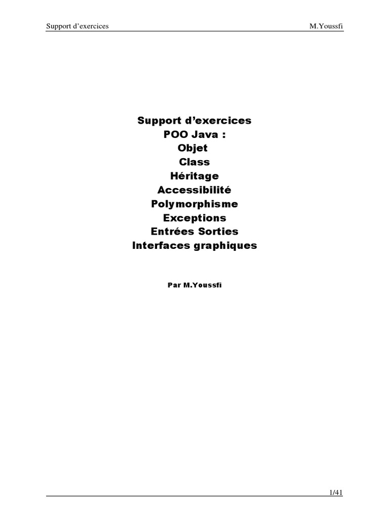 Support dexercices POO Java : Objet Class Hritage Accessibilit Polymorphisme Exceptions Entres Sorties Interfaces graphiques