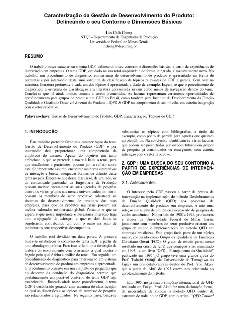 intervenção em empresas. O tema GDP, estudado na sua total amplitude e de forma integrada, é razoavelmente novo. No trabalho, um procedimento de diagnóstico em sistemas de desenvolvimento de produtos é apresentado em forma de perguntas e por intermédio deste, uma estrutura de classificação de tópicos relevantes de GDP é gerada. Com base na estrutura, literatura pertinente a cada um dos tópicos é apresentada a título de exemplo. Espera-se que o procedimento de diagnóstico, a estrutura de classificação e a literatura apresentada sirvam como meios de navegação dentro do tema. Conclui-se que há ainda muitas lacunas a serem preenchidas. As lacunas representam certamente oportunidades de aprofundamento para grupos de pesquisa em GDP no Brasil, como também para Instituto de Desdobramento da Função Qualidade e Gestão de Desenvolvimento do Produto – IQFD & GDP no cumprimento da sua missão, em estreita integração com o setor produtivo.