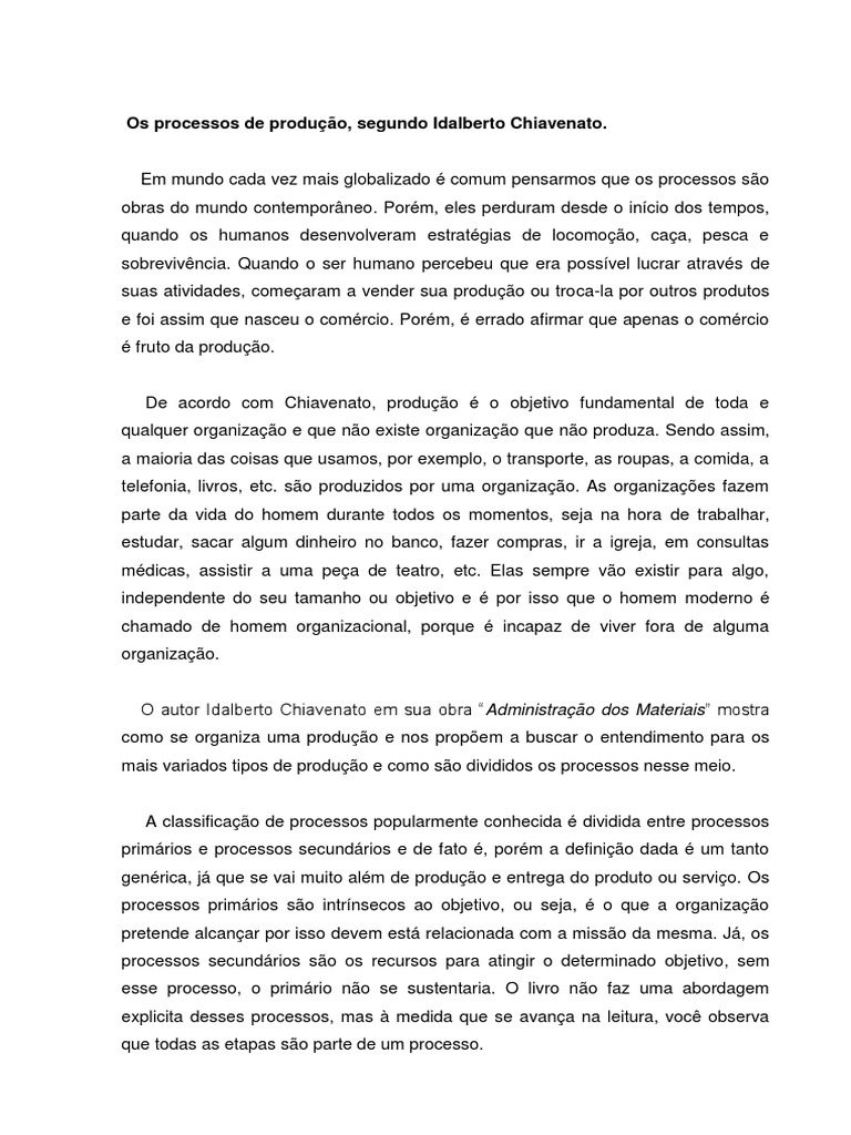 De acordo com Chiavenato, produo o objetivo fundamental de toda e qualquer organizao e que no existe organizao que no produza. Sendo assim, a maioria das coisas que usamos, por exemplo, o transporte, as roupas, a comida, a telefonia, livros, etc. so produzidos por uma organizao. As organizaes fazem parte da vida do homem durante todos os momentos, seja na hora de trabalhar, estudar, sacar algum dinheiro no banco, fazer compras, ir a igreja, em consultas mdicas, assistir a uma pea de teatro, etc. Elas sempre vo existir para algo, independente do seu tamanho ou objetivo e por isso que o homem moderno chamado de homem organizacional, porque incapaz de viver fora de alguma organizao. O autor Idalberto Chiavenato em sua obra Administrao dos Materiais mostra como se organiza uma produo e nos propem a buscar o entendimento para os mais variados tipos de produo e como so divididos os processos nesse meio.