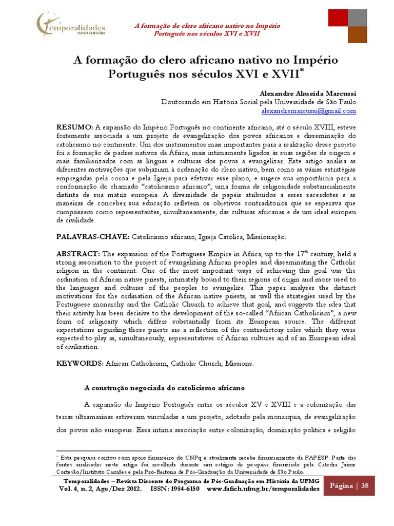 Alexandre Almeida Marcussi Doutorando em Histria Social pela Universidade de So Paulo alexandremarcussi@gmail.com RESUMO: A expanso do Imprio Portugus no continente africano, at o sculo XVIII, esteve fortemente associada a um projeto de evangelizao dos povos africanos e disseminao do catolicismo no continente. Um dos instrumentos mais importantes para a realizao desse projeto foi a formao de padres nativos da frica, mais intimamente ligados s suas regies de origem e mais familiarizados com as lnguas e culturas dos povos a evangelizar. Este artigo analisa as diferentes motivaes que subjaziam ordenao do clero nativo, bem como as vrias estratgias empregadas pela coroa e pela Igreja para efetivar esse plano, e sugere sua importncia para a conformao do chamado catolicismo africano, uma forma de religiosidade substancialmente distinta de sua matriz europeia. A diversidade de papis atribudos a esses sacerdotes e as maneiras de conceber sua educao refletem os objetivos contraditrios que se esperava que cumprissem como representantes, simultaneamente, das culturas africanas e de um ideal europeu de civilidade. PALAVRAS-CHAVE: Catolicismo africano, Igreja Catlica, Missionao. ABSTRACT: The expansion of the Portuguese Empire in Africa, up to the 17 th century, held a strong association to the project of evangelizing African peoples and disseminating the Catholic religion in the continent. One of the most important ways of achieving this goal was the ordination of African native priests, intimately bound to their regions of origin and more used to the languages and cultures of the peoples to evangelize. This paper analyses the distinct motivations for the ordination of the African native priests, as well the strategies used by the Portuguese monarchy and the Catholic Church to achieve that goal, and suggests the idea that their activity has been decisive to the development of the so-called African Catholicism, a new form of religiosity which differs substantially from its European source. The different expectations regarding those priests are a reflection of the contradictory roles which they were expected to play as, simultaneously, representatives of African cultures and of an European ideal of civilization. KEYWORDS: African Catholicism, Catholic Church, Missions. A construo negociada do catolicismo africano A expanso do Imprio Portugus entre os sculos XV e XVIII e a colonizao das terras ultramarinas estiveram vinculadas a um projeto, adotado pela monarquia, de evangelizao dos povos no europeus. Essa ntima associao entre colonizao, dominao poltica e religio