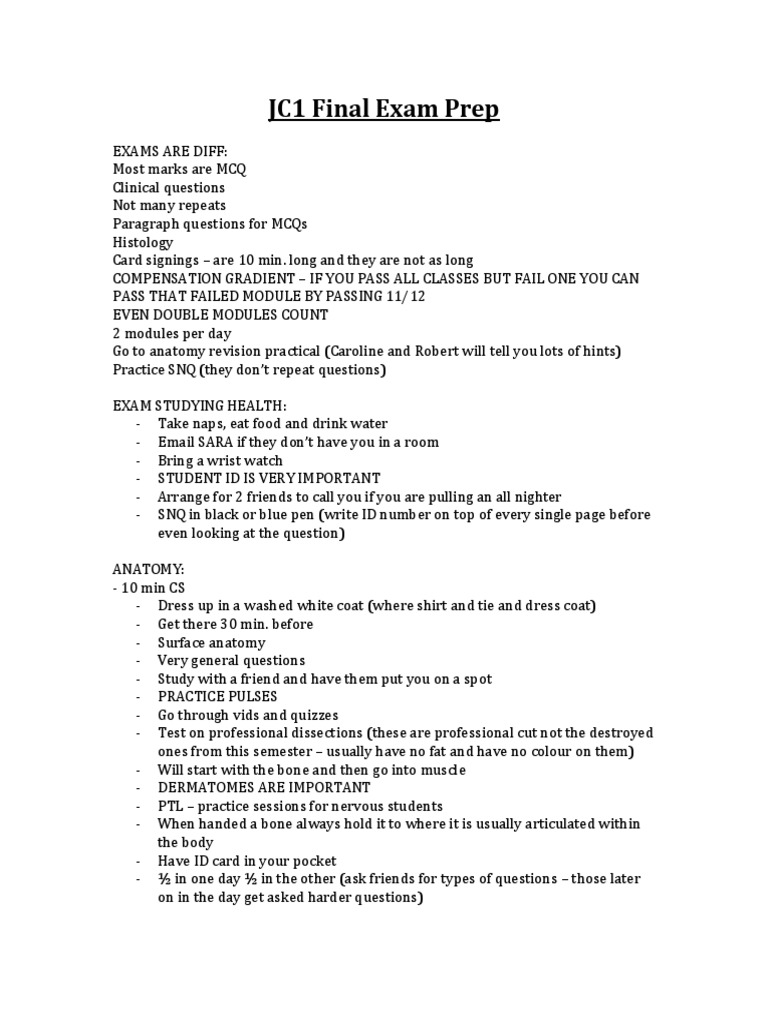 EXAMS ARE DIFF: Most marks are MCQ Clinical questions Not many repeats Paragraph questions for MCQs Histology Card signings – are 10 min. long and they are not as long COMPENSATION GRADIENT – IF YOU PASS ALL CLASSES BUT FAIL ONE YOU CAN PASS THAT FAILED MODULE BY PASSING 11/12 EVEN DOUBLE MODULES COUNT 2 modules per day Go to anatomy revision practical (Caroline and Robert will tell you lots of hints) Practice SNQ (they don’t repeat questions) EXAM STUDYING HEALTH: - Take naps, eat food and drink water - Email SARA if they don’t have you in a room - Bring a wrist watch - STUDENT ID IS VERY IMPORTANT - Arrange for 2 friends to call you if you are pulling an all nighter - SNQ in black or blue pen (write ID number on top of every single page before even looking at the question) ANATOMY: - 10 min CS - Dress up in a washed white coat (where shirt and tie and dress coat) - Get there 30 min. before - Surface anatomy - Very general questions - Study with a friend and have them put you on a spot - PRACTICE PULSES - Go through vids and quizzes - Test on professional dissections (these are professional cut not the destroyed ones from this semester – usually have no fat and have no colour on them) - Will start with the bone and then go into muscle - DERMATOMES ARE IMPORTANT - PTL – practice sessions for nervous students - When handed a bone always hold it to where it is usually articulated within the body - Have ID card in your pocket - ½ in one day ½ in the other (ask friends for types of questions – those later on in the day get asked harder questions)