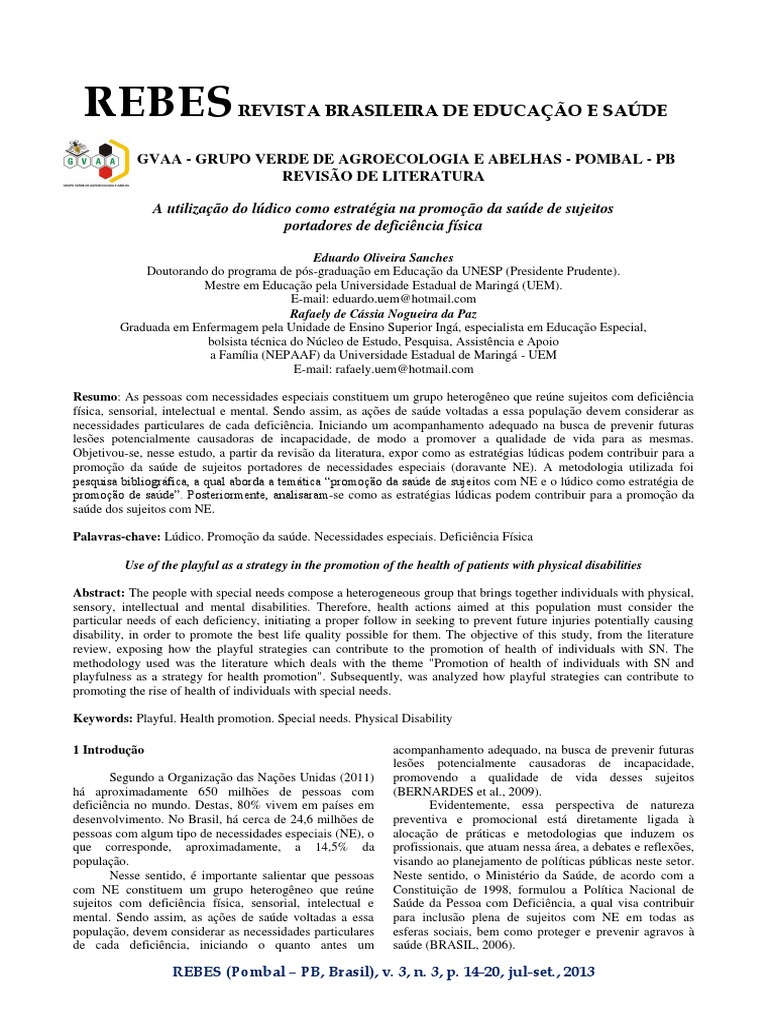 Eduardo Oliveira Sanches Doutorando do programa de ps-graduao em Educao da UNESP (Presidente Prudente). Mestre em Educao pela Universidade Estadual de Maring (UEM). E-mail: eduardo.uem@hotmail.com Rafaely de Cssia Nogueira da Paz Graduada em Enfermagem pela Unidade de Ensino Superior Ing, especialista em Educao Especial, bolsista tcnica do Ncleo de Estudo, Pesquisa, Assistncia e Apoio a Famlia (NEPAAF) da Universidade Estadual de Maring - UEM E-mail: rafaely.uem@hotmail.com Resumo: As pessoas com necessidades especiais constituem um grupo heterogneo que rene sujeitos com deficincia fsica, sensorial, intelectual e mental. Sendo assim, as aes de sade voltadas a essa populao devem considerar as necessidades particulares de cada deficincia. Iniciando um acompanhamento adequado na busca de prevenir futuras leses potencialmente causadoras de incapacidade, de modo a promover a qualidade de vida para as mesmas. Objetivou-se, nesse estudo, a partir da reviso da literatura, expor como as estratgias ldicas podem contribuir para a promoo da sade de sujeitos portadores de necessidades especiais (doravante NE). A metodologia utilizada foi pesquisa bibliogrfica, a qual aborda a temtica promoo da sade de suje itos com NE e o ldico como estratgia de promoo de sade. Posteriormente, analisaram-se como as estratgias ldicas podem contribuir para a promoo da sade dos sujeitos com NE. Palavras-chave: Ldico. Promoo da sade. Necessidades especiais. Deficincia Fsica Use of the playful as a strategy in the promotion of the health of patients with physical disabilities Abstract: The people with special needs compose a heterogeneous group that brings together individuals with physical, sensory, intellectual and mental disabilities. Therefore, health actions aimed at this population must consider the particular needs of each deficiency, initiating a proper follow in seeking to prevent future injuries potentially causing disability, in order to promote the best life quality possible for them. The objective of this study, from the literature review, exposing how the playful strategies can contribute to the promotion of health of individuals with SN. The methodology used was the literature which deals with the theme "Promotion of health of individuals with SN and playfulness as a strategy for health promotion". Subsequently, was analyzed how playful strategies can contribute to promoting the rise of health of individuals with special needs. Keywords: Playful. Health promotion. Special needs. Physical Disability 1 Introduo Segundo a Organizao das Naes Unidas (2011) h aproximadamente 650 milhes de pessoas com deficincia no mundo. Destas, 80% vivem em pases em desenvolvimento. No Brasil, h cerca de 24,6 milhes de pessoas com algum tipo de necessidades especiais (NE), o que corresponde, aproximadamente, a 14,5% da populao. Nesse sentido, importante salientar que pessoas com NE constituem um grupo heterogneo que rene sujeitos com deficincia fsica, sensorial, intelectual e mental. Sendo assim, as aes de sade voltadas a essa populao, devem considerar as necessidades particulares de cada deficincia, iniciando o quanto antes um acompanhamento adequado, na busca de prevenir futuras leses potencialmente causadoras de incapacidade, promovendo a qualidade de vida desses sujeitos (BERNARDES et al., 2009). Evidentemente, essa perspectiva de natureza preventiva e promocional est diretamente ligada alocao de prticas e metodologias que induzem os profissionais, que atuam nessa rea, a debates e reflexes, visando ao planejamento de polticas pblicas neste setor. Neste sentido, o Ministrio da Sade, de acordo com a Constituio de 1998, formulou a Poltica Nacional de Sade da Pessoa com Deficincia, a qual visa contribuir para incluso plena de sujeitos com NE em todas as esferas sociais, bem como proteger e prevenir agravos sade (BRASIL, 2006).