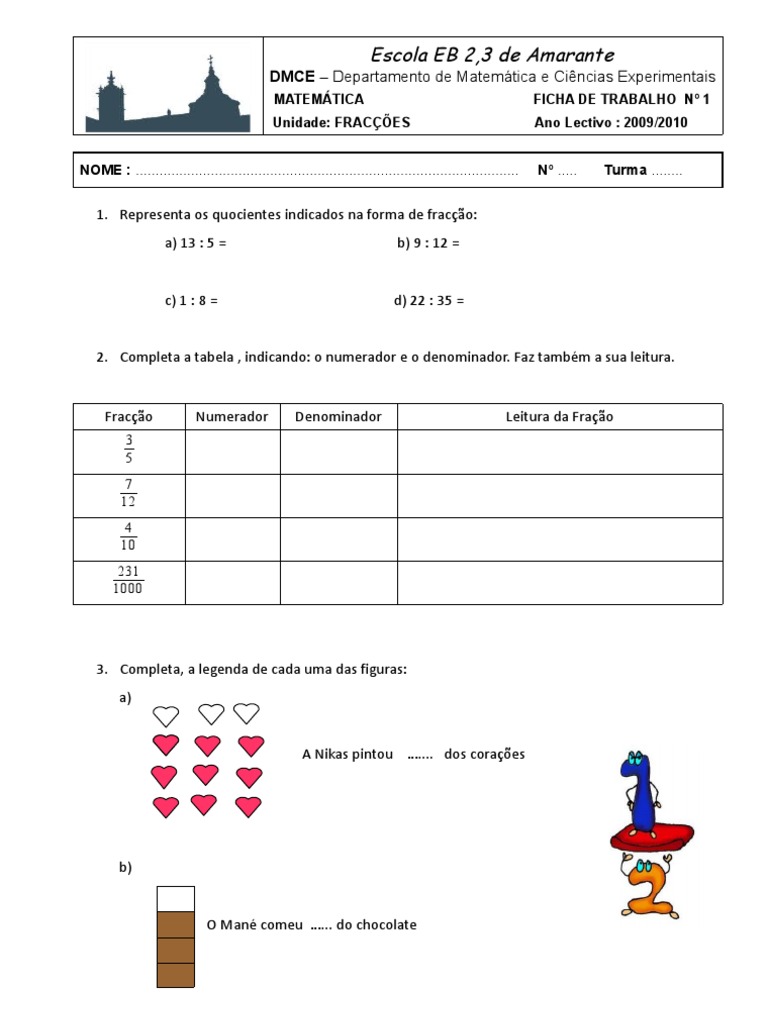 2. Completa a tabela , indicando: o numerador e o denominador. Faz também a sua leitura.
