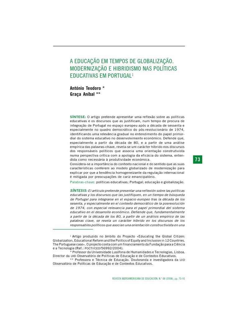 1 Artigo produzido no âmbito do Projecto «Educating the Global Citizen: Globalization, Educational Reform and the Politics of Equity and Inclusion in 12 Countries. The Portuguese case». O projecto conta com um financiamento da Fundação para a Ciência e a Tecnologia (Ref.: POCTI/CED/56992/2004). * Professor da Universidade Lusófona de Humanidades e Tecnologias, Lisboa. Director da UID Observatório de Políticas de Educação e de Contextos Educativos. ** Professora e Técnica de Educação. Doutoranda e investigadora da UID Observatório de Políticas de Educação e de Contextos Educativos.
