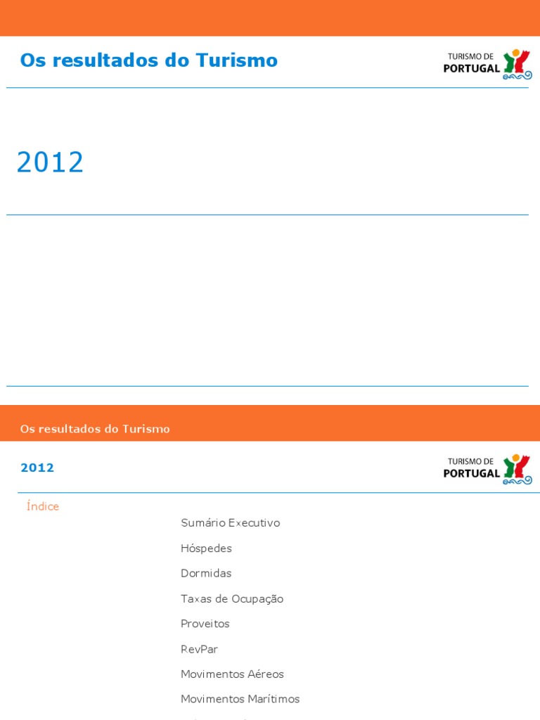 +2. mais 607.8 milhões de dormidas (+0..3%) com tendências de decréscimo.0 milhões de € do que em 2011. ou seja.2 mil passageiros do que em 2011. apenas 0. 3 . • Reino Unido liderou o ranking dos principais mercados estrangeiros desembarcados. com 2. +5. com 6. • Algarve foi também. refletindo uma quebra de 2.º lugar com 3.4 mil dormidas (-6.9 mil milhões de € no País. de 1.Os resultados do Turismo 2012 • Taxas médias de ocupação-cama (41.4% (-45. face a 2011).p.7 p. • Algarve registou o maior número de dormidas de • Aeroportos nacionais.4%. • Proveitos de aposento (69% do total de proveitos) Sumário Executivo Os Resultados do Turismo é um documento de análise da conjuntura do turismo em Portugal.7%).5€) que registou uma diminuição.8%). a região que se posicionou em 1. Síntese das principais conclusões do ano de 2012: • 13.9 mil dormidas do que em 2011. face a 2011. 10.6 milhões passageiros (-3. • Proveitos totais atingiram 1.9 milhões de hóspedes nas unidades hoteleiras que originaram 39.0%.6 mil milhões de € (+460.2%. estrangeiros emissores de dormidas.2 mil dormidas do que em 2011). estrangeiros do País.3%) e quarto (51. • Reino Unido liderou o ranking dos principais mercados atingiram 1. Esta evolução justifica o comportamento do rácio do RevPar (31.5 p. ou seja. de divulgação trimestral.4%). Este relatório consolida os resultados finais do ano de 2012. que se traduziram num aumento de 6.2 milhões de €).6 milhões de passageiros desembarcados de voos internacionais (+324. e ocupação-quarto.2%). ou seja.3 mil dormidas do que em 2011 (+2.4 milhões e com mais 137. • Receitas do turismo atingiram 8.p. ou seja.3 milhões de € e uma diminuição de 1.8 milhões. face a 2011. face a 2011.8%.6 mil €). com 12.6€ (-4. +324. face a 2011 (-15.6%).5 milhões de dormidas embora com um decréscimo de 240. Ocupação-cama diminui 1. para o mercado interno.