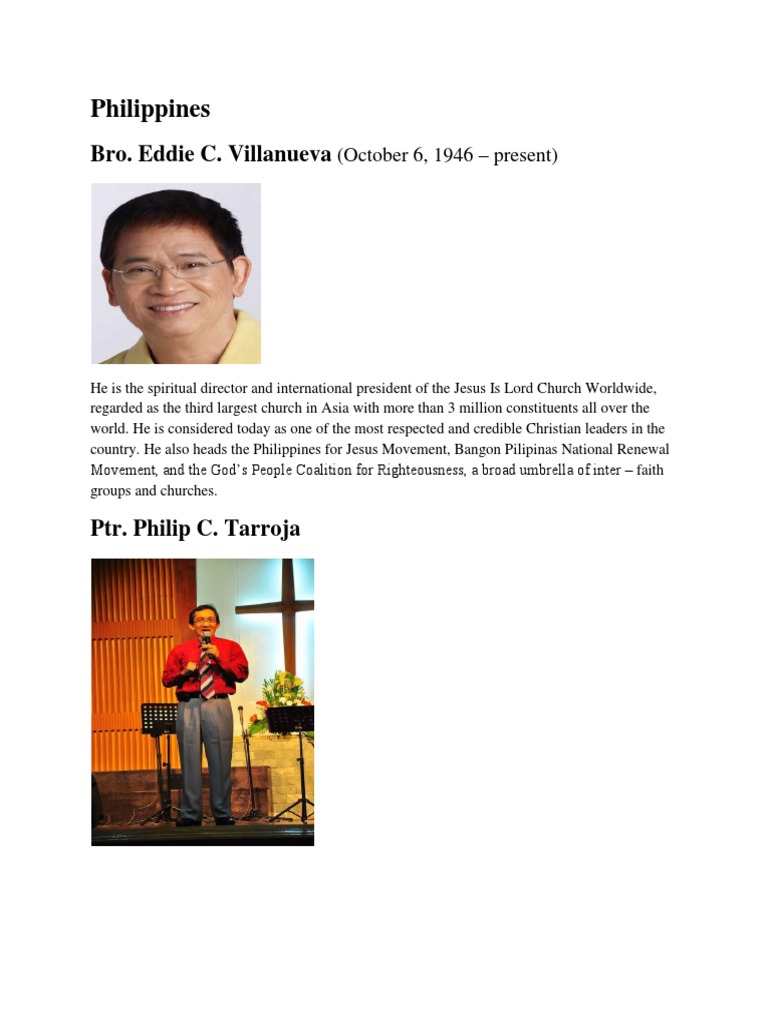 He is the spiritual director and international president of the Jesus Is Lord Church Worldwide, regarded as the third largest church in Asia with more than 3 million constituents all over the world. He is considered today as one of the most respected and credible Christian leaders in the country. He also heads the Philippines for Jesus Movement, Bangon Pilipinas National Renewal Movement, and the God’s People Coalition for Righteousness, a broad umbrella of inter – faith groups and churches.