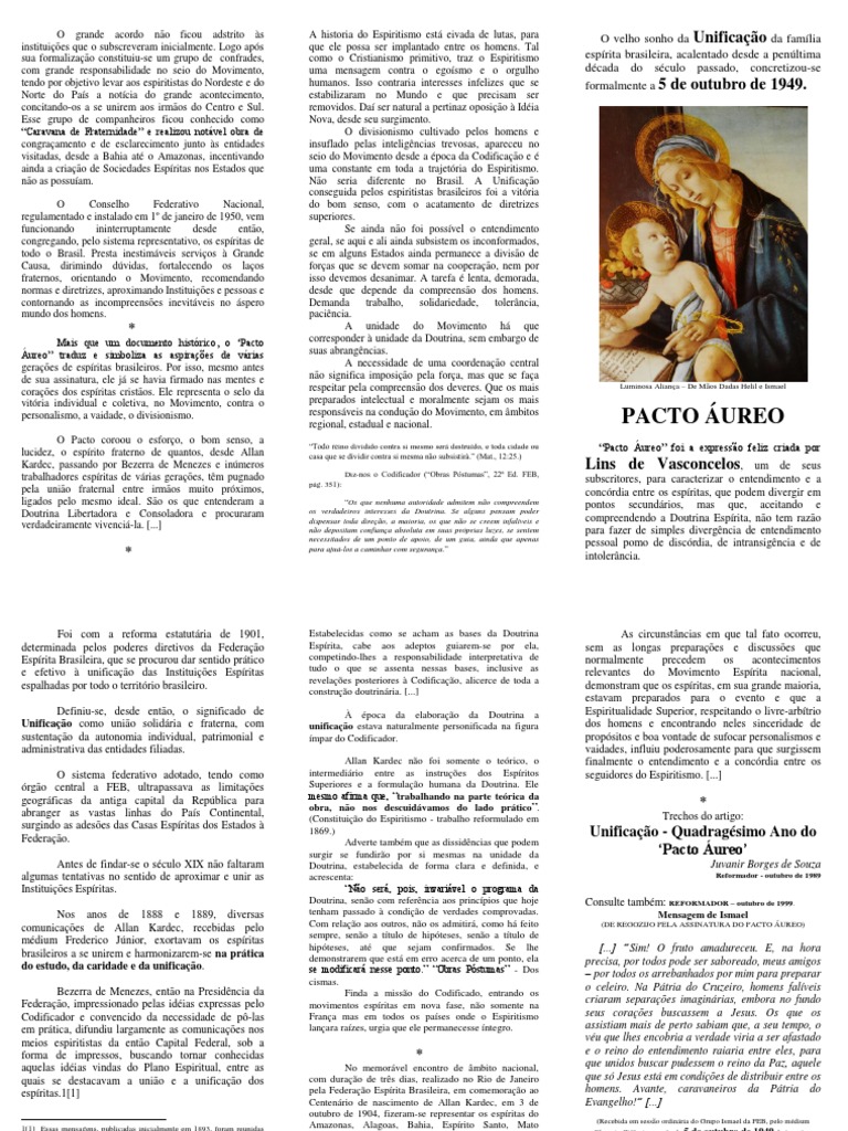 Mais que um documento histrico, o Pacto ureo traduz e simboliza as aspiraes de vrias geraes de espritas brasileiros. Por isso, mesmo antes de sua assinatura, ele j se havia firmado nas mentes e coraes dos espritas cristos. Ele representa o selo da vitria individual e coletiva, no Movimento, contra o personalismo, a vaidade, o divisionismo. O Pacto coroou o esforo, o bom senso, a lucidez, o esprito fraterno de quantos, desde Allan Kardec, passando por Bezerra de Menezes e inmeros trabalhadores espritas de vrias geraes, tm pugnado pela unio fraternal entre irmos muito prximos, ligados pelo mesmo ideal. So os que entenderam a Doutrina Libertadora e Consoladora e procuraram verdadeiramente vivenci-la. [...]