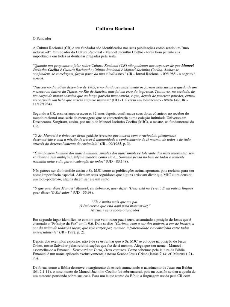 O Fundador A Cultura Racional (CR) e seu fundador so identificados nas suas publicaes como sendo um "uno indivisvel". O fundador da Cultura Racional - Manoel Jacintho Coelho - torna bem patente sua importncia em todas as doutrinas pregadas pela seita. "Quando nos propomos a falar sobre Cultura Racional (CR) no podemos nos esquecer de que Manoel Jacintho Coelho Cultura Racional e Cultura Racional Manoel Jacintho Coelho. Ambos se confundem, se entrelaam, fazem parte do uno e indivisvel" (JR - Jornal Racional - 09/1985 - o negrito nosso). "Nasceu no dia 30 de dezembro de 1903, e no dia do seu nascimento os jornais noticiaram a queda de um meteoro no bairro da Tijuca, no Rio de Janeiro, mas foi um erro da imprensa. Tratou-se, na verdade, de um corpo de massa csmica que ao longe parecia uma estrela, e que, depois de penetrar paredes, entrou no corpo de um beb que nascia naquele instante" (UD - Universo em Desencanto - 8/894.149; JR 11/12/1984). Segundo a CR, essa criana cresceu e, 32 anos depois, confirmava seus dotes csmicos ao receber do mundo racional uma srie de mensagens que se caracterizaria numa coleo intitulada Universo em Desencanto. Surgiram, assim, por meio de Manoel Jacintho Coelho (MJC), o mestre, os fundamentos da CR. "O Sr. Manoel o nico ser desta galxia terrestre que nasceu com o raciocnio plenamente desenvolvido e com a misso de trazer humanidade o conhecimento de si mesma, de todos e de tudo, atravs do desenvolvimento do raciocnio" (JR - 09/1985, p. 3). " um homem humilde dos mais humildes, simples dos mais simples e tolerante dos mais tolerantes, sem vaidades e sem ambies, julga a matria como ela ... Somente pensa no bem de todos e somente trabalha noite e dia para a salvao de todos" (UD - 83.148). No parece ser to humilde assim o Sr. MJC como as publicaes acima apontam, pois reclama para seu nome importncia especial. Afirmam seus seguidores que alguns arriscam dizer que MJC um deus ou um todo-poderoso, alguns dizem ser ele um santo. "O que quer dizer Manoel? Manoel, em hebraico, quer dizer: 'Deus est na Terra'. E em outras lnguas quer dizer: 'O Salvador'" (UD - 55.98). "Ele muito mais que um pai. O Pai eterno que est aqui para mostrar luz." Afirma a seita sobre o fundador Em segundo lugar identifica-se como o que veio trazer paz terra, assumindo a posio de Jesus que chamado o "Prncipe da Paz" em Is 9.6. Dele se diz: "Carioca, com a cor dos nativos, a cor de bronze, a cor da unio de todas as raas, que veio trazer paz, o amor, a fraternidade e a concrdia entre todos universalmente" (JR - 1982, p. 2). Depois dos exemplos expostos, no de se estranhar que o Sr. MJC se coloque na posio de Jesus Cristo, nosso Salvador pelas reivindicaes que faz de si mesmo. Alega que seu nome - Manoel assemelha-se a Emanuel: Deus est na Terra, Deus conosco. Como sabemos pela leitura da Bblia, Emanuel um nome aplicado exclusivamente a nosso Senhor Jesus Cristo (Isaas 7.14; cf. Mateus 1.2123). Da forma como a Bblia descreve o surgimento da estrela anunciando o nascimento de Jesus em Belm (Mt 2.1-11), o nascimento de Manoel Jacintho Coelho foi sobrenatural, pois na ocasio se deu a queda de um meteoro pousando sobre sua casa. Para um leitor atento da Bblia a linguagem usada pela CR com