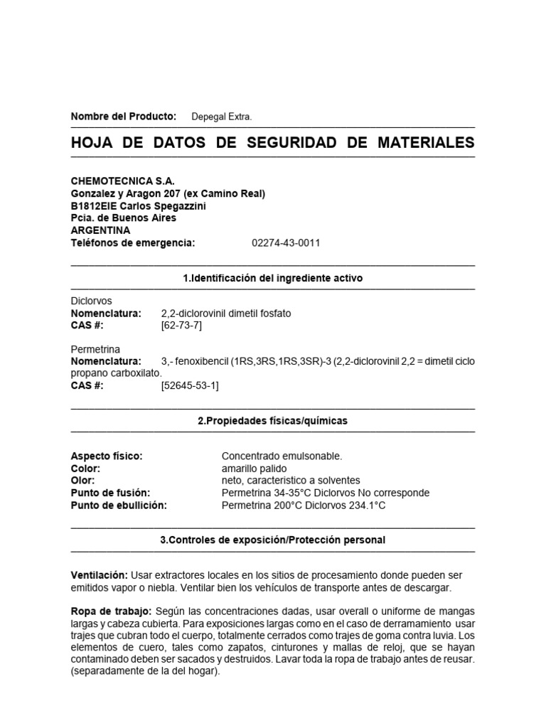 ───────────────────────────────────────────────────────────────────── CHEMOTECNICA S.A. Gonzalez y Aragon 207 (ex Camino Real) B1812EIE Carlos Spegazzini Pcia. de Buenos Aires ARGENTINA Teléfonos de emergencia: 02274-43-0011 ───────────────────────────────────────────────────────────────────── 1.Identificación del ingrediente activo ───────────────────────────────────────────────────────────────────── Diclorvos Nomenclatura: 2,2-diclorovinil dimetil fosfato CAS #: [62-73-7] Permetrina Nomenclatura: 3,- fenoxibencil (1RS,3RS,1RS,3SR)-3 (2,2-diclorovinil 2,2 = dimetil ciclo propano carboxilato. CAS #: [52645-53-1] ───────────────────────────────────────────────────────────────────── 2.Propiedades físicas/químicas ───────────────────────────────────────────────────────────────────── Aspecto físico: Color: Olor: Punto de fusión: Punto de ebullición: Concentrado emulsonable. amarillo palido neto, caracteristico a solventes Permetrina 34-35°C Diclorvos No corresponde Permetrina 200°C Diclorvos 234.1°C