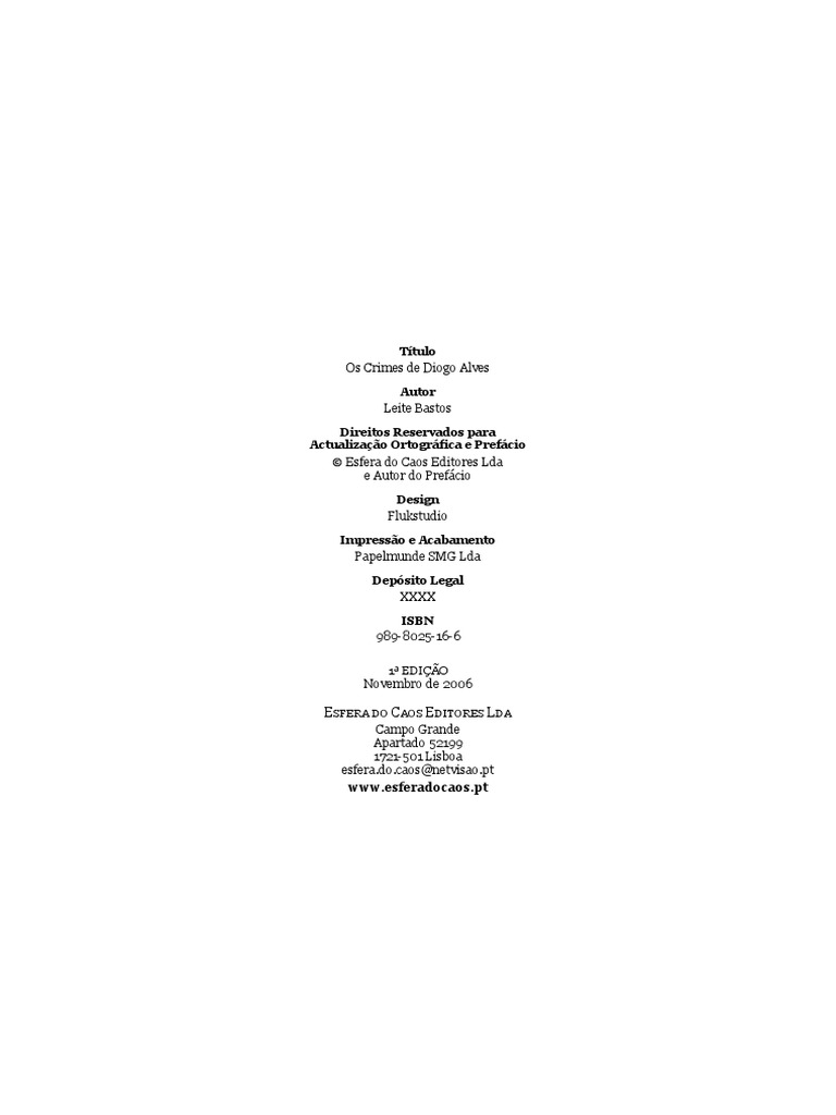 Andrade ― como 10 Caso de O Nacional. que se estrearia no Porto. além deste.. Em 1872. Este filme pioneiro andou perdido e só recentemente foi recuperado. Não vamos. Quase quarenta anos haviam decorrido desde os acontecimentos. os jornais da época preocupavam-se sobretudo com as questões políticas e os casos de crimes apareciam intitulados. o poetastro aponta-o ― é o caso do assalto à casa do dr.10 E apenas em 1838 é que os poucos jornais que então havia começaram a prestar alguma atenção aos desmandos de Diogo Alves. apenas um sinal gráfico de separação em relação ao que anteriormente informa! 10 . Noutros. os romances O Incendiário da Patriarcal e Os Trapeiros de Lisboa. a 26 de Abril de 1911. o seu romance A Calúnia era precedido de umas palavras de Castilho a Camilo acerca do autor. Homem imaginativo.. Bem. pois. com Os Crimes de Diogo Alves. observemos que Francisco Leite Bastos nasceu em 1841. em 1911. O livro hoje publicado foi editado pela primeira e única vez em 1877. Aliás. A verdade é que se Leite Bastos entendeu investigar o caso e rescrevê-lo é porque havia interesse na opinião pública em rever as circunstâncias daquelas malfeitorias. um «canto em verso heróico». Tendo vivido em Lisboa entre 1841 e 1886. à Rua do Almada. quando o jornalista contava 36 anos. contar o que o leitor lerá adiante. antigo Salão da Trindade. António Manuel Terras teve o gesto oportunista de colocar no mercado o folheto O Suplício de Diogo Alves. Continuava latente a questão. de um modo tão simples como Notas diversas.Porém. Tal como aconteceu com o já aqui referido. logo a seguir à execução. inventário é como quem diz. mas prevenimos que se trata de um inventário romanesco de barbaridades do perigoso quadrilheiro. exactamente no ano da execução de Diogo Alves. Por outro lado. Numa linguagem empertigada. no livro de Leite Bastos. os seus livros mais populares foram. Leite Bastos morreu ainda bastante novo. a notícia nem sequer apresenta título. E andava muito atento aos gostos dos leitores. Há ainda a considerar uma série de comédias e peças de teatro de actualidade. mesmo em jornais mais populares. no espaço deste prefácio. que ele próprio adaptou ao teatro. a primeira tentativa de filme de ficção em Portugal é praticada pelo realizador João Tavares. porque o número das suas vítimas no aqueduto nunca pôde ser calculado.