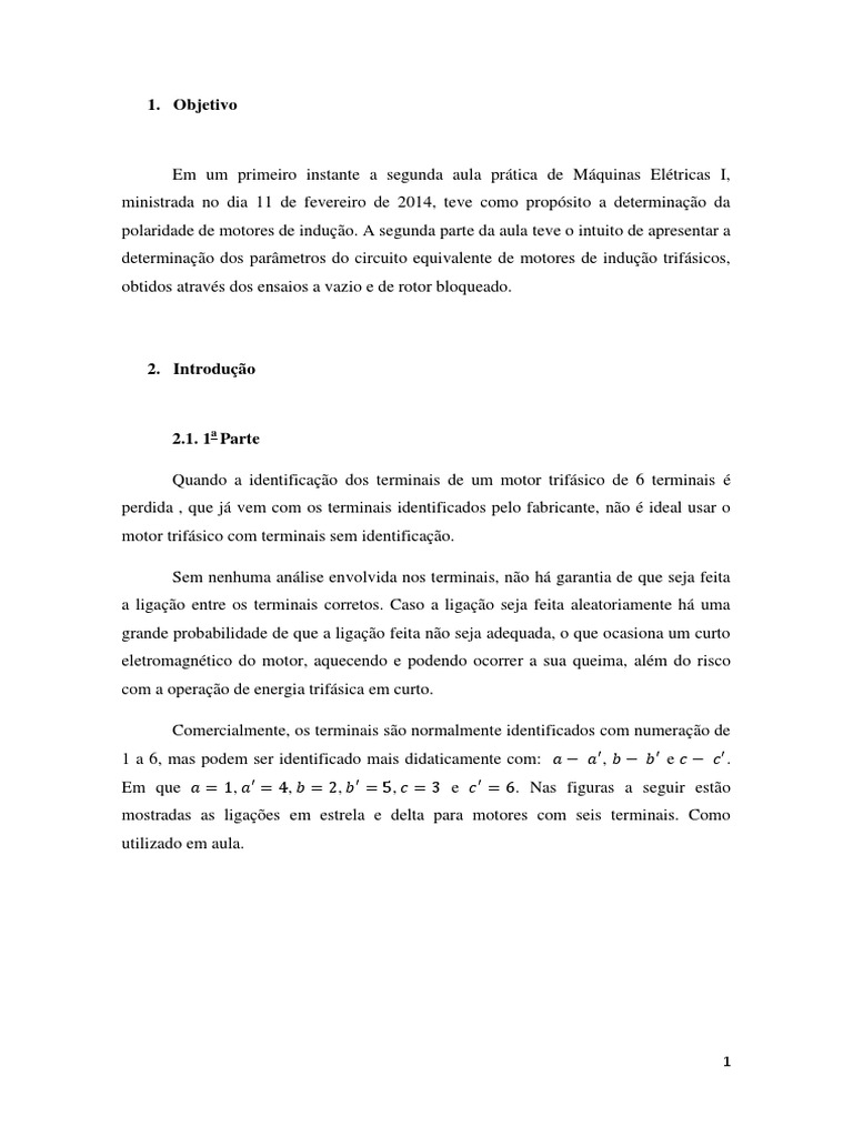 Em um primeiro instante a segunda aula prática de Máquinas Elétricas I, ministrada no dia 11 de fevereiro de 2014, teve como propósito a determinação da polaridade de motores de indução. A segunda parte da aula teve o intuito de apresentar a determinação dos parâmetros do circuito equivalente de motores de indução trifásicos, obtidos através dos ensaios a vazio e de rotor bloqueado.