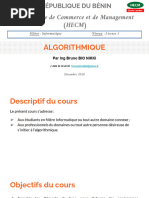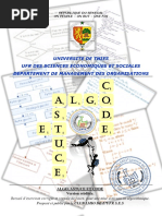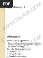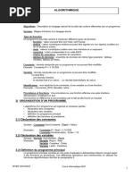 Les applications sont parfois prsentes au cours du chapitre et parfois la fin. Elles sont conues de faon tablir le lien entre les nouvelles notions et les apprentissages antrieurs. Les exercices figurant la fin du chapitre suivent en gnral lavancement du cours et sont prsents en ordre de difficults croissantes. Ils sont conus de faon permettre lapprenant une meilleure assimilation des notions tudies. Le premier chapitre intitul Les structures de donnes et les structures simples est conu pour rappeler et renforcer lutilisation des structures de donnes prsentes au niveau de la 2me anne de la filire Technologies de linformatique. Un complment sur les types numrs, les types utilisateurs et les tableaux deux dimensions figure aussi dans ce chapitre. Le deuxime et le troisime chapitre prsentent respectivement les structures algorithmiques de contrle (les diffrentes formes de la structure conditionnelle et des itrations) ainsi que les sous programmes sous les deux formes : fonctions et procdures. Les quatre derniers chapitres prsentent les grandes familles dalgorithmes savoir : - les algorithmes de tri et de recherches - les algorithmes rcurrents - les algorithmes arithmtiques - les algorithmes doptimisation et dapproximation Nous invitons les utilisateurs de ce manuel nous faire part de leurs critiques et de leurs suggestions et nous les remercions davance.