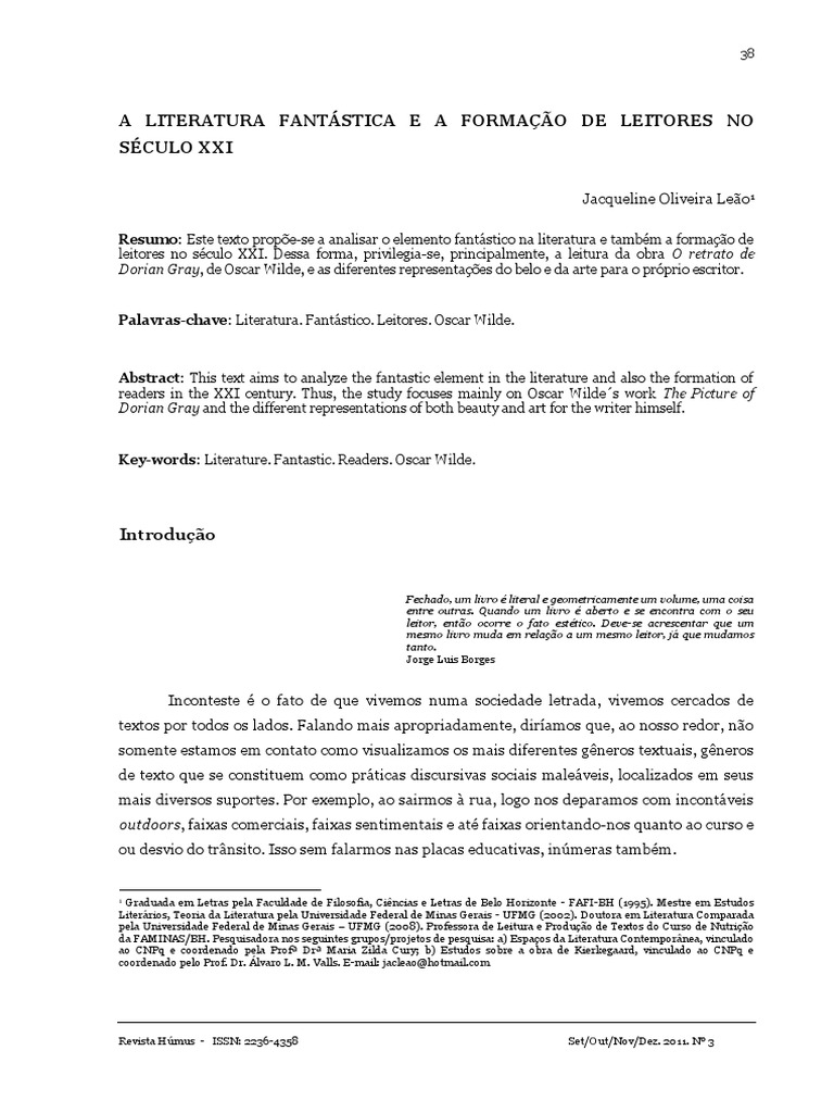 Abstract: This text aims to analyze the fantastic element in the literature and also the formation of readers in the XXI century. Thus, the study focuses mainly on Oscar Wildes work The Picture of Dorian Gray and the different representations of both beauty and art for the writer himself.