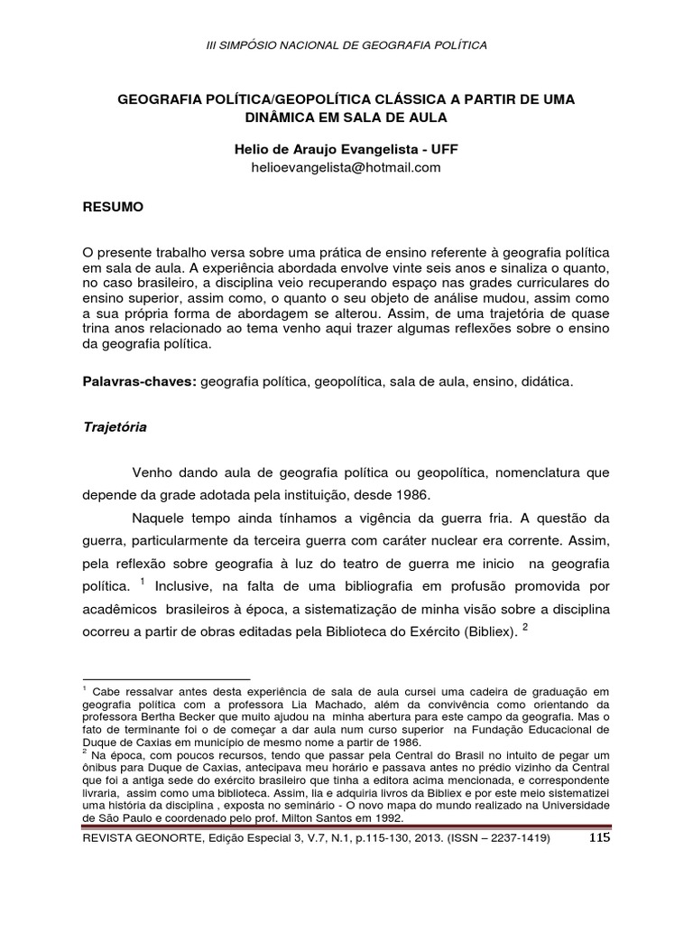 Cabe ressalvar antes desta experincia de sala de aula cursei uma cadeira de graduao em geografia poltica com a professora Lia Machado, alm da convivncia como orientando da professora Bertha Becker que muito ajudou na minha abertura para este campo da geografia. Mas o fato de terminante foi o de comear a dar aula num curso superior na Fundao Educacional de Duque de Caxias em municpio de mesmo nome a partir de 1986. 2 Na poca, com poucos recursos, tendo que passar pela Central do Brasil no intuito de pegar um nibus para Duque de Caxias, antecipava meu horrio e passava antes no prdio vizinho da Central que foi a antiga sede do exrcito brasileiro que tinha a editora acima mencionada, e correspondente livraria, assim como uma biblioteca. Assim, lia e adquiria livros da Bibliex e por este meio sistematizei uma histria da disciplina , exposta no seminrio - O novo mapa do mundo realizado na Universidade de So Paulo e coordenado pelo prof. Milton Santos em 1992. REVISTA GEONORTE, Edio Especial 3, V.7, N.1, p.115-130, 2013. (ISSN 2237-1419)