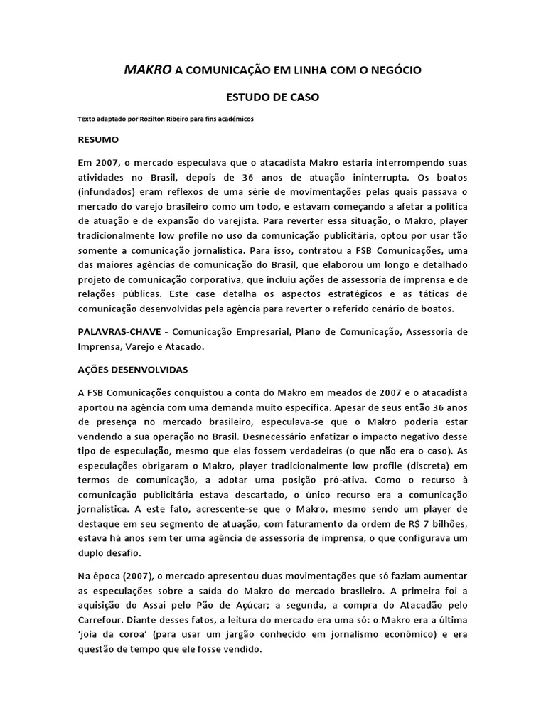 RESUMO Em 2007, o mercado especulava que o atacadista Makro estaria interrompendo suas atividades no Brasil, depois de 36 anos de atuao ininterrupta. Os boatos (infundados) eram reflexos de uma srie de movimentaes pelas quais passava o mercado do varejo brasileiro como um todo, e estavam comeando a afetar a poltica de atuao e de expanso do varejista. Para reverter essa situao, o Makro, player tradicionalmente low profile no uso da comunicao publicitria, optou por usar to somente a comunicao jornalstica. Para isso, contratou a FSB Comunicaes, uma das maiores agncias de comunicao do Brasil, que elaborou um longo e detalhado projeto de comunicao corporativa, que incluiu aes de assessoria de imprensa e de relaes pblicas. Este case detalha os aspectos estratgicos e as tticas de comunicao desenvolvidas pela agncia para reverter o referido cenrio de boatos. PALAVRAS-CHAVE - Comunicao Empresarial, Plano de Comunicao, Assessoria de Imprensa, Varejo e Atacado. AES DESENVOLVIDAS A FSB Comunicaes conquistou a conta do Makro em meados de 2007 e o atacadista aportou na agncia com uma demanda muito especfica. Apesar de seus ento 36 anos de presena no mercado brasileiro, especulava-se que o Makro poderia estar vendendo a sua operao no Brasil. Desnecessrio enfatizar o impacto negativo desse tipo de especulao, mesmo que elas fossem verdadeiras (o que no era o caso). As especulaes obrigaram o Makro, player tradicionalmente low profile (discreta) em termos de comunicao, a adotar uma posio pr-ativa. Como o recurso comunicao publicitria estava descartado, o nico recurso era a comunicao jornalstica. A este fato, acrescente-se que o Makro, mesmo sendo um player de destaque em seu segmento de atuao, com faturamento da ordem de R$ 7 bilhes, estava h anos sem ter uma agncia de assessoria de imprensa, o que configurava um duplo desafio. Na poca (2007), o mercado apresentou duas movimentaes que s faziam aumentar as especulaes sobre a sada do Makro do mercado brasileiro. A primeira foi a aquisio do Assa pelo Po de Acar; a segunda, a compra do Atacado pelo Carrefour. Diante desses fatos, a leitura do mercado era uma s: o Makro era a ltima joia da coroa (para usar um jargo conhecido em jornalismo econmico) e era questo de tempo que ele fosse vendido.