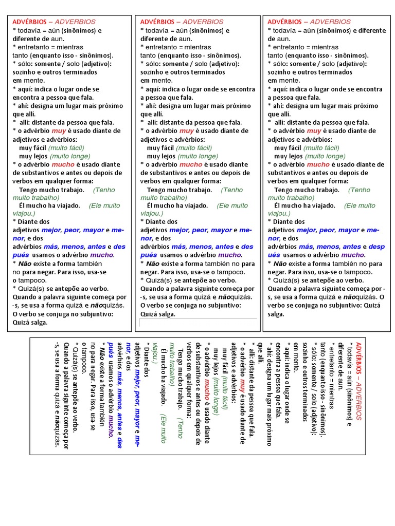 . * slo: somente / solo (adjetivo): sozinho e outros terminados em mente. * aqu: indica o lugar onde se encontra a pessoa que fala. * ah: designa um lugar mais prximo que all. * all: distante da pessoa que fala. * o advrbio muy usado diante de adjetivos e advrbios: muy fcil (muito fcil) muy lejos (muito longe) * o advrbio mucho usado diante de substantivos e antes ou depois de verbos em qualquer forma: Tengo mucho trabajo. (Tenho muito trabalho) l mucho ha viajado. (Ele muito viajou.) * Diante dos adjetivos mejor, peor, mayor e menor, e dos advrbios ms, menos, antes e des pus usamos o advrbio mucho. * No existe a forma tambin no para negar. Para isso, usa-se o tampoco. * Quiz(s) se antepe ao verbo. Quando a palavra siguinte comea por -s, se usa a forma quiz e noquizs. O verbo se conjuga no subjuntivo: Quiz salga.