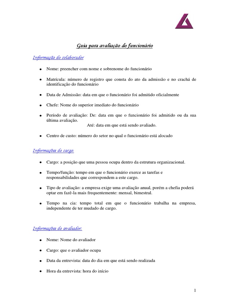 Nome: preencher com nome e sobrenome do funcionrio Matrcula: nmero de registro que consta do ato da admisso e no crach de identificao do funcionrio Data de Admisso: data em que o funcionrio foi admitido oficialmente Chefe: Nome do superior imediato do funcionrio Perodo de avaliao: De: data em que o funcionrio foi admitido ou da sua ltima avaliao. At: data em que est sendo avaliado. Centro de custo: nmero do setor no qual o funcionrio est alocado