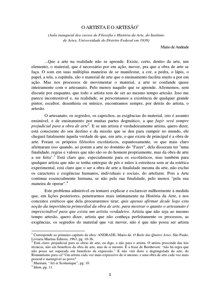 Corresponde ao primeiro captulo da obra: ANDRADE, Mario de. O Baile das Quatro Artes. So Paulo, Livraria Martins Editora, 1963, pg. 10-36. 2 Est claro: prejudicial para as obras de arte, eu digo, e no para o artista. O artista prescinde das leis tcnicas, no em benefcio da obra de arte, mas de si mesmo. a frase de Beethoven: no h regra que no possa ser superada em benefcio da expresso. E no vir disto a degringolada da arte, do Romantismo para c? Um artista cada vez mais expressivo de si mesmo, e uma obra de arte cada vez mais pessoal e inatingvel ao povo? 3 Maritain, Art et Scolastique, pg. 10. 4 Idem, pg. 11.
