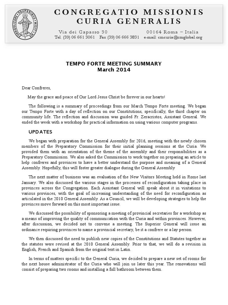 With regard to the Ratio Formationis, it is our hope that the final text will be ready by the second half of 2015. It will be comprised of six chapters and published in two separate issues of Vincentiana. Each chapter, including the introduction, will be accompanied by an article written by confreres from various regions of the Congregation. We received a report from Fr. John Rybolt, who is composing a compendium for the 400th anniversary of the Congregation in 2017. Hopefully, it will be published and ready for the General Assembly in 2016. In preparation, each province of the Congregation is asked to send the Secretary General a minimum of 2 to 3 significant pictures that represent the province to the Congregation. A formal letter of request on this matter to each Visitor will be forthcoming.