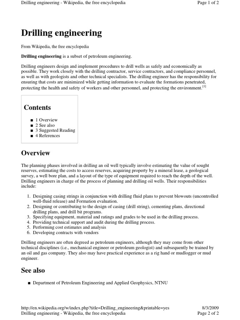 http://en.wikipedia.org/w/index.php?title=Drilling_engineering&printable=yes 8/3/2009