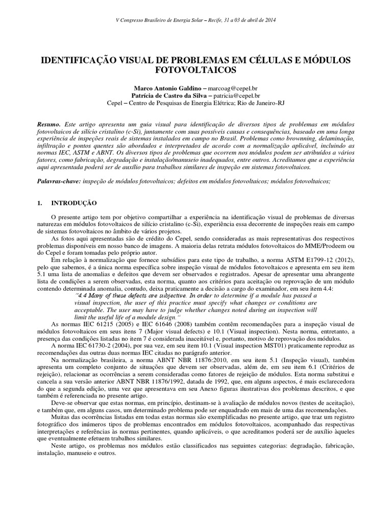 de sistemas fotovoltaicos no âmbito de vários projetos. As fotos aqui apresentadas são de crédito do Cepel, sendo consideradas as mais representativas dos respectivos problemas disponíveis em nosso banco de imagens. A maioria delas retrata módulos fotovoltaicos do MME/Prodeem ou do Cepel e foram tomadas pelo próprio autor. Em relação à normalização que fornece subsídios para este tipo de trabalho, a norma ASTM E1799-12 (2012), pelo que sabemos, é a única norma específica sobre inspeção visual de módulos fotovoltaicos e apresenta em seu item 5.1 uma lista de anomalias e defeitos que devem ser observados e registrados. Apesar de apresentar uma abrangente lista de condições a serem observadas, esta norma, quanto aos critérios para aceitação ou reprovação de um módulo contendo determinada anomalia, contudo, deixa praticamente a decisão a cargo do examinador, em seu item 4.4: