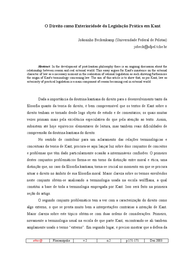 Dada a importncia da doutrina kantiana do direito para o desenvolvimento tanto da filosofia quanto da teoria do direito, bem compreensvel que os textos de Kant sobre o direito tenham se tornado desde logo objeto de estudo e de comentrios, os quais muitas vezes primam mais pela excelncia especulativa do que pela ateno ao texto. Assim, subsistem at hoje equvocos elementares de leitura, mas tambm reais dificuldades de compreenso da doutrina kantiana do direito. No sentido de contribuir para um aclaramento das relaes terminolgicas e conceituais da teoria de Kant, procura-se aqui lanar luz sobre dois conjuntos de conceitos e problemas que tm dado particularmente ocasio a interminveis confuses. O primeiro destes conjuntos problemticos forma-se em torno da distino entre moral e tica, uma distino que, no caso da filosofia kantiana, torna-se crucial no momento em que se procura situar o direito no mbito de sua filosofia moral. Maior clareza sobre os termos envolvidos neste conjunto obtm-se analisando a terminologia usada na escola wolffiana, a qual constitui a base de toda a terminologia empregada por Kant. Isso ser feito na primeira seo do artigo. O segundo conjunto problemtico tem a ver com a caracterizao do direito como algo externo, o que se presta muito bem a interpretaes contrrias inteno de Kant. Maior clareza sobre este tpico obtm-se com duas ordens de consideraes. Primeiro, novamente a terminologia usual na escola de que parte Kant, encontrando-se ali tambm amplamente usado o termo externo. Em segundo lugar, preciso mostrar que a defesa da