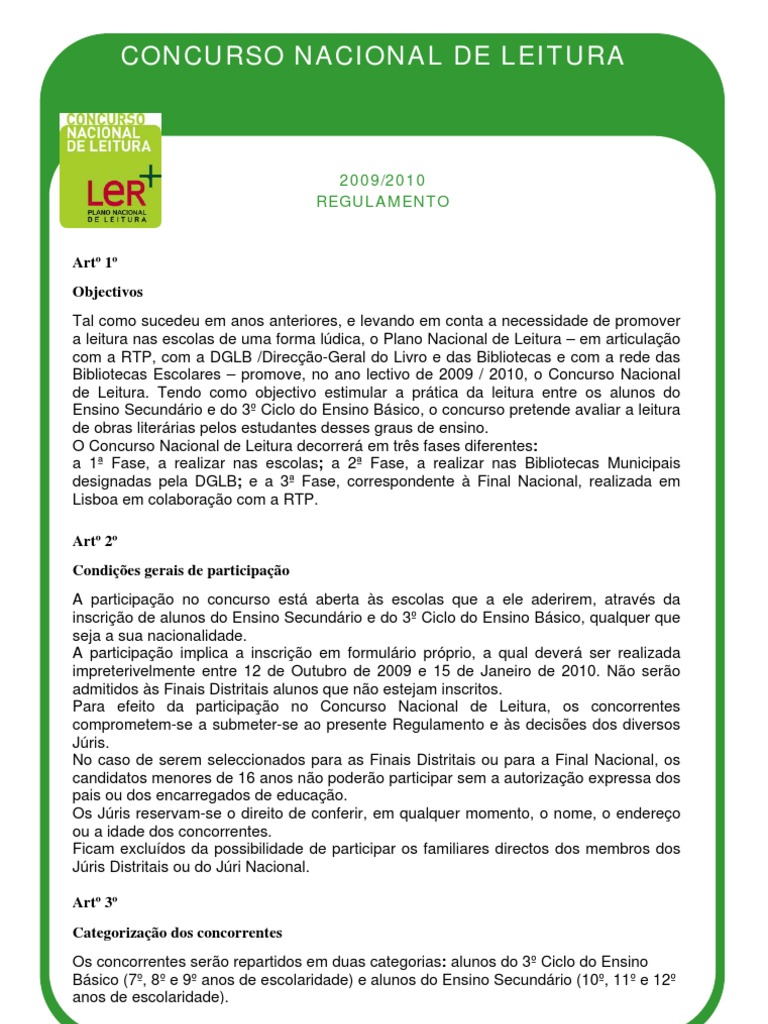 impreterivelmente entre 12 de Outubro de 2009 e 15 de Janeiro de 2010. Não serão admitidos às Finais Distritais alunos que não estejam inscritos. Para efeito da participação no Concurso Nacional de Leitura, os concorrentes comprometem-se a submeter-se ao presente Regulamento e às decisões dos diversos Júris. No caso de serem seleccionados para as Finais Distritais ou para a Final Nacional, os candidatos menores de 16 anos não poderão participar sem a autorização expressa dos pais ou dos encarregados de educação. Os Júris reservam-se o direito de conferir, em qualquer momento, o nome, o endereço ou a idade dos concorrentes. Ficam excluídos da possibilidade de participar os familiares directos dos membros dos Júris Distritais ou do Júri Nacional.