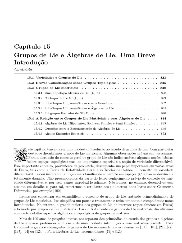 Iremos nos concentrar em exemplicar o conceito de grupo de Lie tratando primordialmente de grupos de Lie matriciais. Isso simplica um pouco o tratamento e reduz um tanto o escopo destas notas introdut orias. No entanto, a grande maioria dos grupos de Lie de interesse (especialmente em F sica) e formada por grupos de Lie matriciais. Para o tratamento de grupos de Lie matriciais discutiremos com certo detalhe aspectos alg ebricos e topol ogicos de grupos de matrizes. Mais de 100 anos de pesquisa intensa nos separam dos prim ordios do estudo dos grupos e a lgebras de Lie e nossas pretens oes aqui s ao a de uma modesta introdu ca o a esse vast ssimo assunto. Para tratamentos gerais e abrangentes de grupos de Lie recomendamos as refer encias [106], [101], [21], [77], [137], [64] ou [124], . Para a lgebras de Lie, recomendamos [73] e [120]. 822
