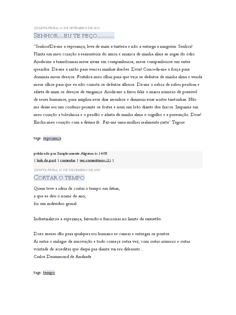 Quem teve a idia de cortar o tempo em fatias, a que se deu o nome de ano, foi um indivduo genial. Industrializou a esperana, fazendo-a funcionar no limite da exausto. Doze meses do para qualquer ser humano se cansar e entregar os pontos. A entra o milagre da renovao e tudo comea outra vez, com outro nmero e outra vontade de acreditar que daqui pra diante vai ser diferente... Carlos Drummond de Andrade tags: tempo
