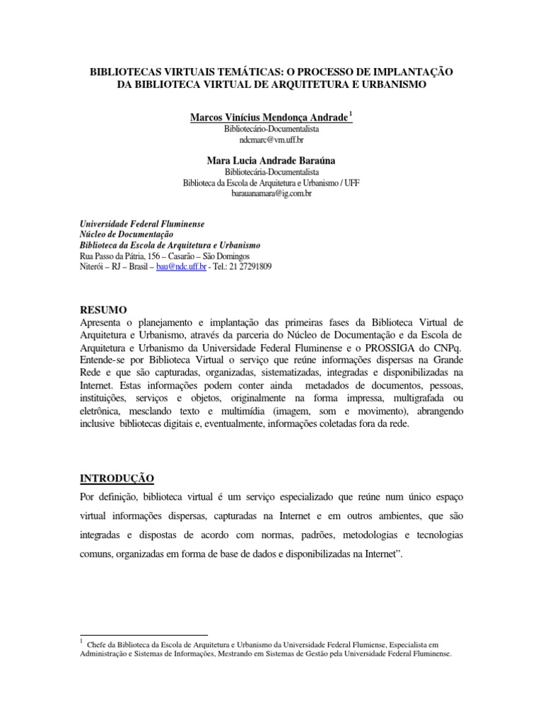 4. CONCLUSO Atentos nova ordem no fluxo de criao, disseminao e transferncia de informao, e, conseqentemente de conhecimento, a equipe da Biblioteca da Escola de Arquitetura e Urbanismo da Universidade Federal Fluminense props a criao de uma biblioteca virtual que contemplasse as reas de arquitetura e urbanismo. A idia foi adiante culminando com a formalizao de Convnio entre a Universidade e o IBICT, objetivando a criao da referida BV. Muito alm de centralizar e organizar sites sobre arquitetura e urbanismo, a Biblioteca Virtual Temtica de Arquitetura Urbanismo que est sendo construda, agilidade propiciar
