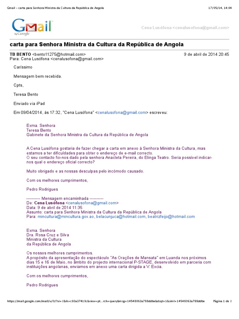 17/05/14, 14:04 Gmail - carta para Senhora Ministra da Cultura da Repblica de Angola