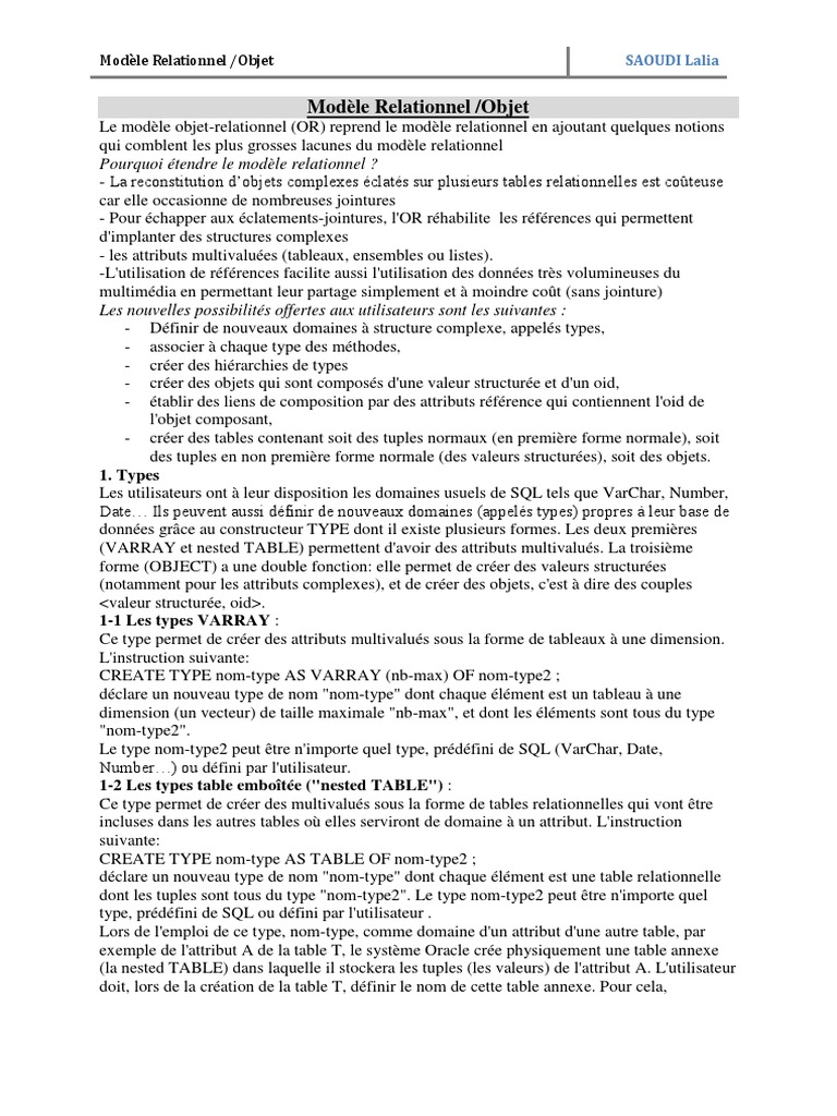 Le modle objet-relationnel (OR) reprend le modle relationnel en ajoutant quelques notions