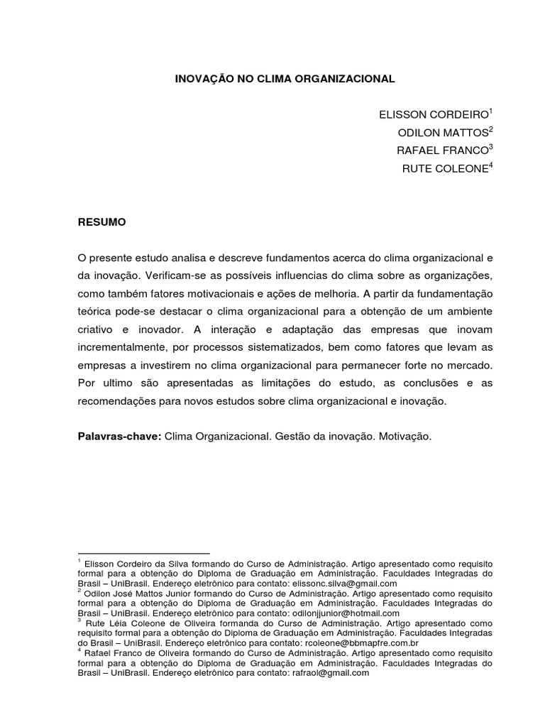 Palavras-chave: Clima Organizacional. Gesto da inovao. Motivao.