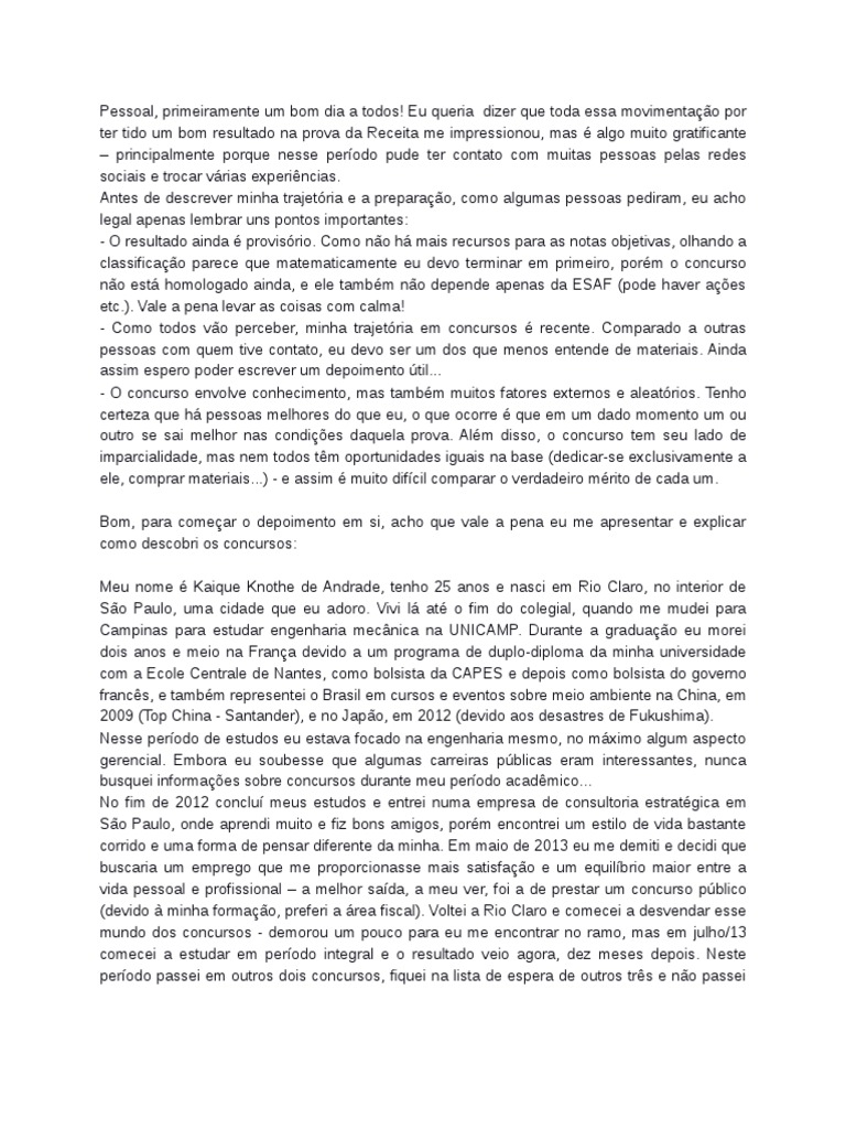 Meu nome é Kaique Knothe de Andrade, tenho 25 anos e nasci em Rio Claro, no interior de São Paulo, uma cidade que eu adoro. Vivi lá até o fim do colegial, quando me mudei para Campinas para estudar engenharia mecânica na UNICAMP. Durante a graduação eu morei dois anos e meio na França devido a um programa de duplodiploma da minha universidade com a Ecole Centrale de Nantes, como bolsista da CAPES e depois como bolsista do governo francês, e também representei o Brasil em cursos e eventos sobre meio ambiente na China, em 2009 (Top China Santander), e no Japão, em 2012 (devido aos desastres de Fukushima). Nesse período de estudos eu estava focado na engenharia mesmo, no máximo algum aspecto gerencial. Embora eu soubesse que algumas carreiras públicas eram interessantes, nunca busquei informações sobre concursos durante meu período acadêmico No fim de 2012 concluí meus estudos e entrei numa empresa de consultoria estratégica em São Paulo, onde aprendi muito e fiz bons amigos, porém encontrei um estilo de vida bastante corrido e uma forma de pensar diferente da minha. Em maio de 2013 eu me demiti e decidi que buscaria um emprego que me proporcionasse mais satisfação e um equilíbrio maior entre a vida pessoal e profissional – a melhor saída, a meu ver, foi a de prestar um concurso público (devido à minha formação, preferi a área fiscal). Voltei a Rio Claro e comecei a desvendar esse mundo dos concursos demorou um pouco para eu me encontrar no ramo, mas em julho/13 comecei a estudar em período integral e o resultado veio agora, dez meses depois. Neste período passei em outros dois concursos, fiquei na lista de espera de outros três e não passei