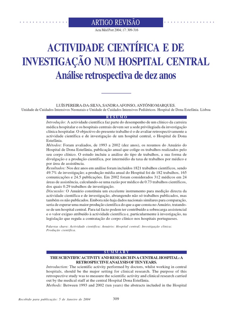 Conclusions: The Scientific Year Book was an extremely useful tool to directly measure the scientific activity and research of doctors working at the Hospital. não encontrámos qualquer trabalho que medisse a produção científica em hospitais portugueses. O Hospital de Dona Estefânia é um hospital central materno-infantil contando.29 research studies. 165 communications and 24. Neste âmbito. em 1993. No entanto. Scientific activity. Coutinho apoiou-se em indicadores obtidos de bases de dados internacionais de informação bibliográfica. da mulher e reprodução. a Medline4. que a investigação clínica portuguesa se posicionava mais ou menos à metade do que devíamos estar na média mundial. Coutinho assinalou3.7% of them were considered to be clinical research. nomeadamente da Ásia e de África. 312 doctors in 24 specialties and subspecialties were considered. 1821 studies were included and 49. apenas três edições médicas portuguesas estão indexadas numa das bases mais utilizadas. Assim. sendo de notar que actualmente. Quanto mais progride na carreira. including 0. Results: During the ten years analyzed. de cirurgia. INTRODUÇÃO A actividade de um clínico da carreira médica hospitalar não se esgota no desempenho assistencial. a partir dos dados disponíveis no AHDE. The excessive clinical work and the negligible value for research considered in the Portuguese national regulations for contracting doctors for the permanent staff of central hospitals may have contributed towards the poor motivation of doctors in research found in this study. maiores devem ser as suas responsabilidades em relação à actividade científica e à investigação1. Nonetheless. esta base não inclui trabalhos científicos comunicados mas não publicados. em finais da década de 90. incluindo todos os países menos desenvolvidos e economicamente mais pobres que Portugal. As yet. Maiores são as expectativas quando o clínico exerce a sua função em hospitais centrais. Existe em Portugal pelo menos uma base de informação bibliográfica que inclui as publicações médicas portuguesas4. uma publicação anual criada com o objectivo de coligir os resumos de todos os trabalhos científicos e de investigação realizados pelo corpo clínico do Hospital no ano respectivo. será necessário medir directamente tal actividade. the analyzed scientific activity. até ao ano de 2002. sendo de realçar que o envio dos referidos resumos é inteiramente voluntária. ISBN 972-96348-3-1.73 studies. the number of communications and publications. with a mean ratio per doctor of 0. de medicina física e reabilitação e do ambulatório. Research. com os departamentos de medicina (ligado à universidade). appears to be insufficient considering that the analyzed scientific production belongs to a central hospital. and the scientific production (based on the ratio of number of studies per doctor in each specialty and subspecialty) were determined.5 publications.LUÍS PEREIRA-DA-SILVA et al Dona Estefania’s Scientific Year Book were analyzed. No entanto. é importante que a sua experiência seja difundida para que efectivamente represente um contributo científico à comunidade2. incluindo também os trabalhos não publicados. também constituem a produção científica dos respectivos autores e instituições. para avaliar a produção científica de uma instituição hospitalar. o de 20025-14 (dez anos). Desde 1993 é editado o Anuário do Hospital de Dona Estefânia (AHDE). there is no similar national study available to compare the obtained results. sob a forma de comunicação e/ou publicação. os quais MATERIAL E MÉTODOS Foram analisados os resumos dos trabalhos incluídos no AHDE. including published and unpublished papers. Key words: Central hospital. de pedopsiquiatria. Na literatura consultada. During the year of 2002. os quais devem ser a sede privilegiada da investigação clínica hospitalar3. Scientific production. O objectivo do presente estudo foi o de avaliar retrospectivamente a actividade científica e de investigação do Hospital de Dona Estefânia. desde o início da sua edição. Scientific year book. como hospital central. particularly the clinical research. Na análise retrospectiva foram avaliados: 310 . até ao mais recente. the mean annual scientific production of the Hospital was 182 studies. The type of studies.5.