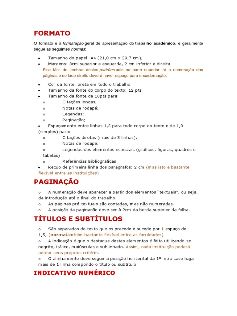 O formato a formatao geral de apresentao do trabalho acadmico, e geralmente
