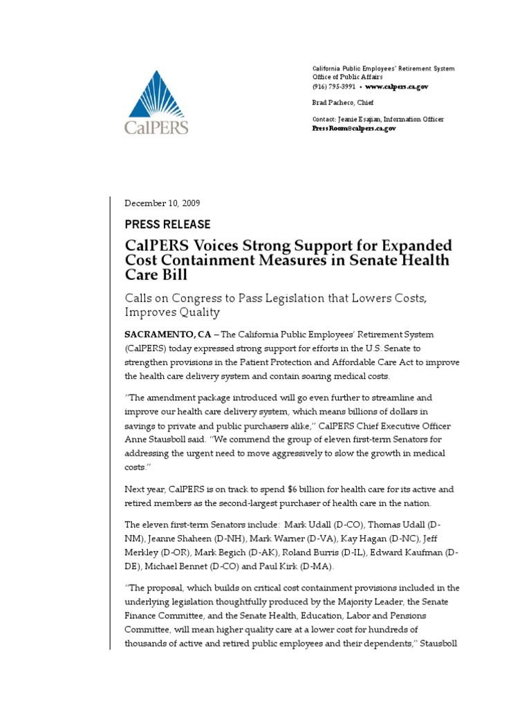 – The California Public Employees’ Retirement System(CalPERS) today expressed strong support for efforts in the U.S. Senate tostrengthen provisions in the Patient Protection and Affordable Care Act to improvethe health care delivery system and contain soaring medical costs.“The amendment package introduced will go even further to streamline andimprove our health care delivery system, which means billions of dollars insavings to private and public purchasers alike,” CalPERS Chief Executive OfficerAnne Stausboll said. “We commend the group of eleven first-term Senators foraddressing the urgent need to move aggressively to slow the growth in medicalcosts.”Next year, CalPERS is on track to spend $6 billion for health care for its active andretired members as the second-largest purchaser of health care in the nation.The eleven first-term Senators include: Mark Udall (D-CO), Thomas Udall (D-NM), Jeanne Shaheen (D-NH), Mark Warner (D-VA), Kay Hagan (D-NC), JeffMerkley (D-OR), Mark Begich (D-AK), Roland Burris (D-IL), Edward Kaufman (D-DE), Michael Bennet (D-CO) and Paul Kirk (D-MA).“The proposal, which builds on critical cost containment provisions included in theunderlying legislation thoughtfully produced by the Majority Leader, the SenateFinance Committee, and the Senate Health, Education, Labor and PensionsCommittee, will mean higher quality care at a lower cost for hundreds ofthousands of active and retired public employees and their dependents,” Stausboll