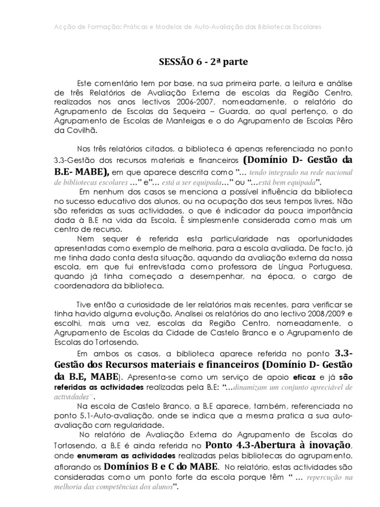 de três Relatórios de Avaliação Externa de escolas da Região Centro,