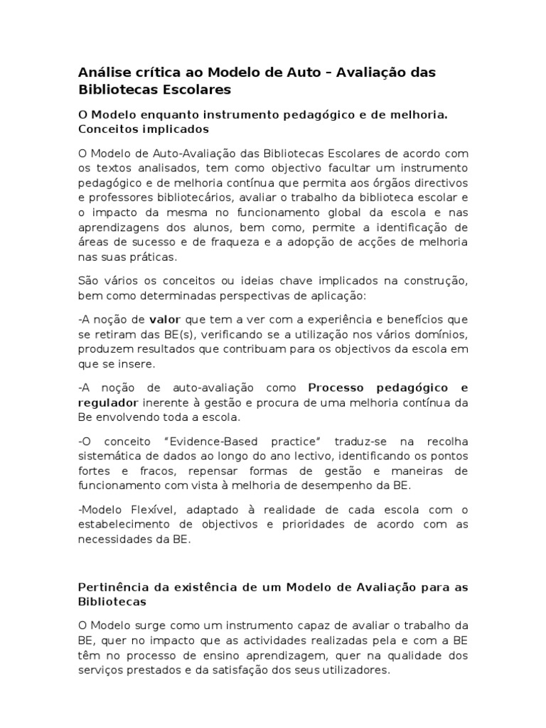 O Modelo de Auto-Avaliação das Bibliotecas Escolares de acordo com