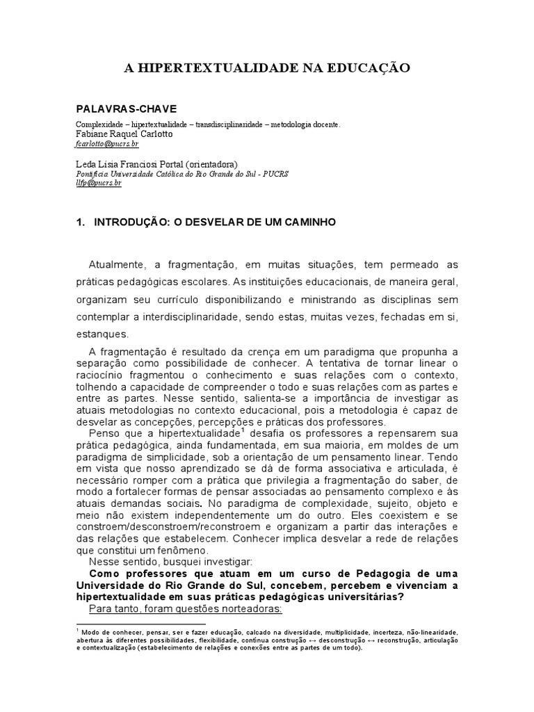 professores concebem, percebem e vivenciam a hipertextualidade em suas práticas pedagógicas e quais as potencialidades desta tecnologia intelectual como proposta metodológica na educação. Acredito que o paradigma de complexidade instaura uma possibilidade de romper com pensamentos e práticas que contemplam unicamente a simplificação e a fragmentação. Nesse