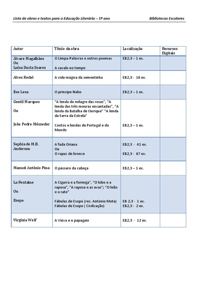 Lista de obras e textos para a Educação Literária – 5º ano